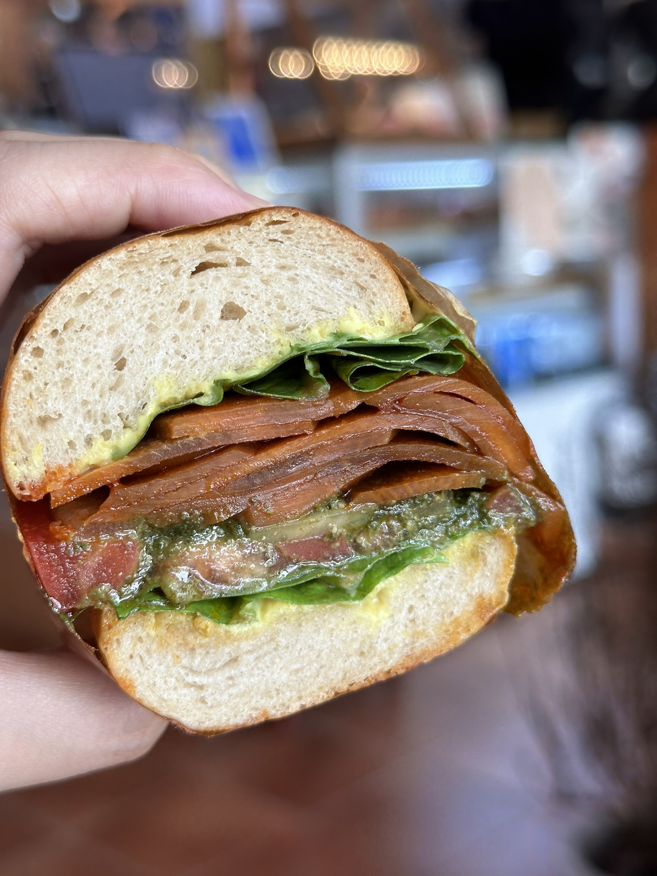당근은 얇게 썰어 조리를 했지만 여전히 단단했다. 생당근보단 아주 살짝 부드러웠지만 ‘아삭’하고 소리가 날 정도로 단단한 식감이었다. 당근을 씹을수록 훈제 향이 아주 강하게 올라왔다. 그리고 처음 맛보는 빨간 양념 맛이 느껴졌다. 양념 맛은 가히 놀라웠는데, 마요네즈인가 싶을 정도로 부드러운 맛이 났고 파프리카 가루를 넣었는지 살짝 매콤함도 느껴졌다. 직원 분께 여쭈니 훈제 당근을 만들 때 들어가는 소스라고 하셨다. 양념에 들어가는 재료가 무엇인지 궁금했지만 더 물었다간 영업 비밀을 캐묻는 곤란한 손님이 될 것 같아 포기하고 돌아섰다. 취나물과 참나물로 만든 페스토도 샌드위치의 강렬한 맛에 한몫했는데, 느끼하지 않고 상큼하면서 감칠맛이 났다.