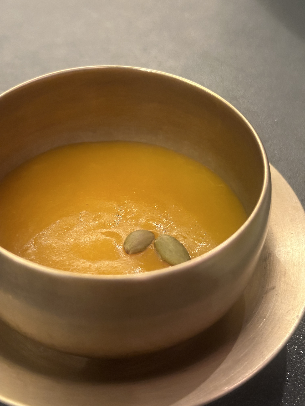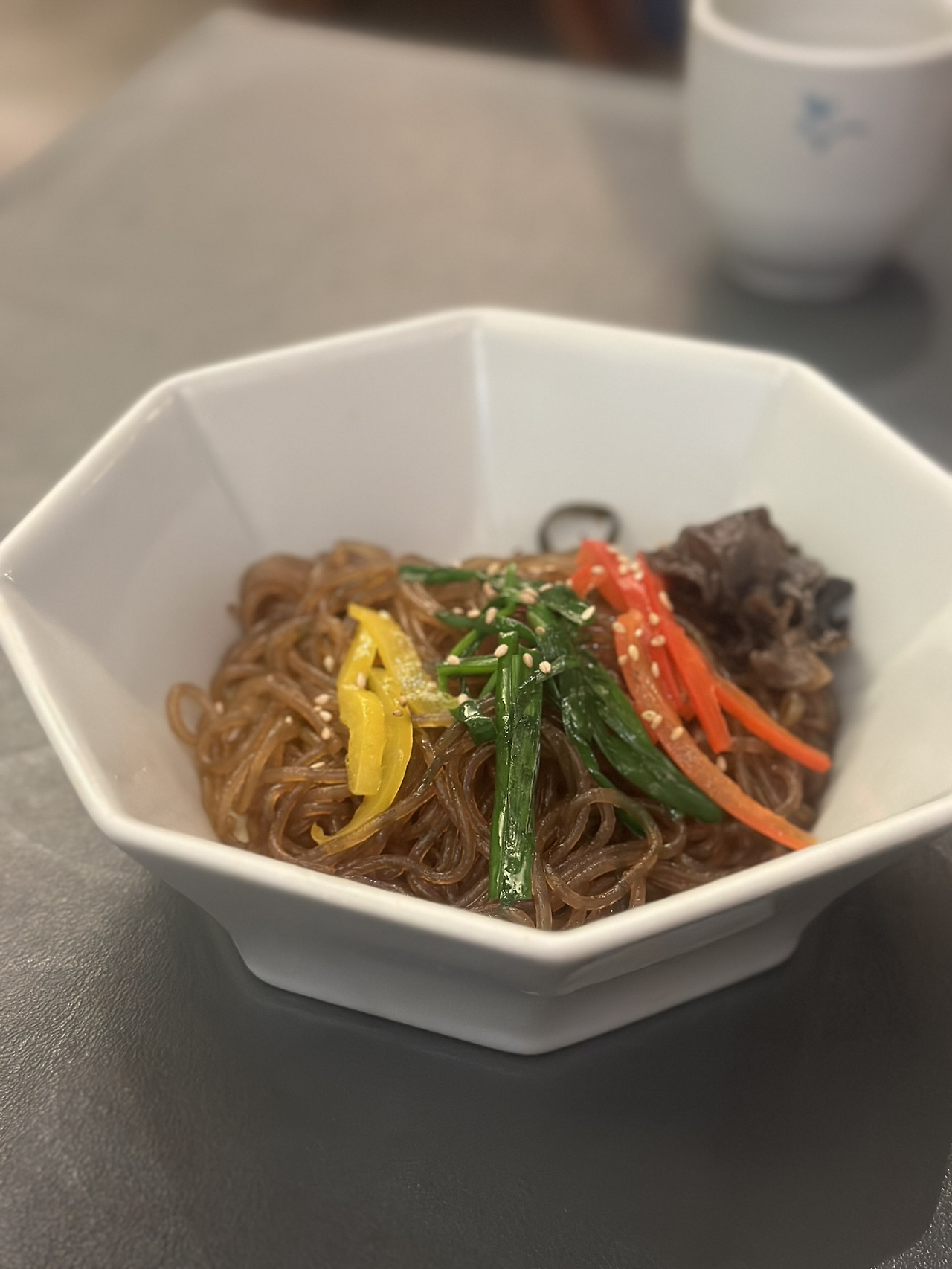 문 밖 복도에서부터 요란한 바퀴 소리가 들리더니 음식을 실은 카트가 도착했다. 검은색 유니폼을 입은 직원분은 음식 여러 개를 순식간에 테이블에 세팅해 주셨다. 처음 나온 음식은 놋그릇에 담긴 노란색 호박죽과 흰 자기 그릇에 담긴 동치미, 그리고 샐러드와 잡채였다. 놋수저와 놋그릇이라니, 괜히 마음이 차분해지고 자세도 고쳐 앉게 됐다. 유자 소스가 들어간 샐러드와 아삭한 오이, 무가 들어간 동치미는 상큼 새콤해 입맛을 돋웠고 적당한 단맛의 호박죽은 허기졌던 뱃속을 달래기 좋았다. 호박죽 한 그릇을 비우니 당이 충전되는 것처럼 눈꺼풀에 힘이 들어가고 기분도 살짝 업되어 설레는 마음으로 다음 요리를 맛봤다. 잡채는 파프리카와 시금치, 부추, 버섯이 들어갔고 그 위에 깨가 조금 뿌려져 있었다. 얇고 탱글한 면이 씹기 좋았고 간도 적당해서 누가 말리지 않으면 계속 들어가는 맛이었다. 박군과 나는 한창 유행 중인 넷플릭스 프로그램 <흑백요리사> 명대사를 흉내 내며 음식 맛을 보고 또 즐겼다.