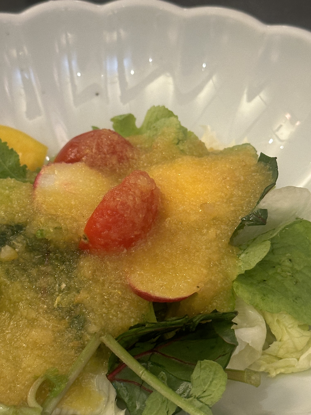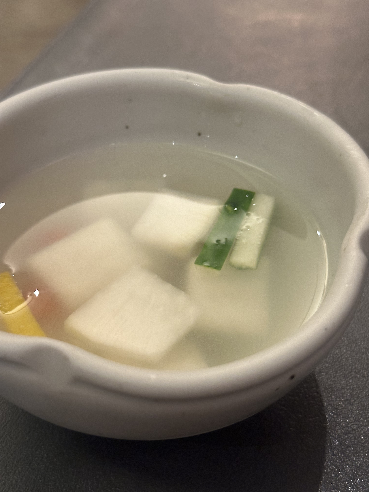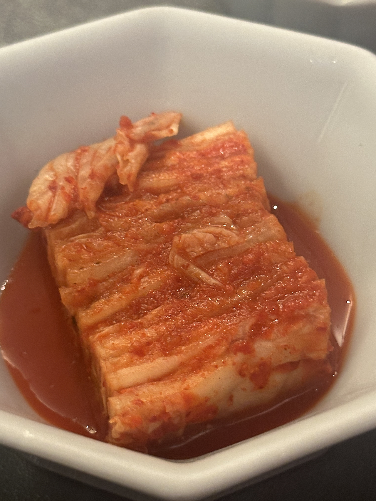 사실 이 식당에서 제일 기대가 되었던 것은 바로 김치였다. 전주를 비롯한 전라도 지역에서 김치를 담글 때 빼먹지 않는 재료가 바로 젓갈이다. 어렸을 때부터 엄마와 광주가 고향인 외할머니 김치를 주로 먹다 보니 내 입맛은 젓갈이 들어간 감칠맛이 감도는 김치가 딱 맞았다. 일평생 젓갈이 들어간 김치에 익숙해져 있었는데 과연 젓갈이 들어가지 않은 김치는 어떤 맛일지 궁금하기도 하고 낯선 세계의 음식인 마냥 기대가 되기도 했다. 겉으로 봤을 땐 영락없는 김치였다. (당연하다.) 조금 다르다고 느껴졌던 것은 건더기가 없이 깔끔하다는 것. 김치 한 조각을 들어 맛을 보았다. 아삭거리는 배추의 식감, 매콤한 맛, 좀 실망스럽게도 크게 다른 맛을 느낄 수 없었다. 젓갈이 들어가지 않아서인지 살짝 가볍고 샐러드 같은 느낌이긴 했지만, 그래서 오히려 깔끔하고 아주 맛있는 김치였다.