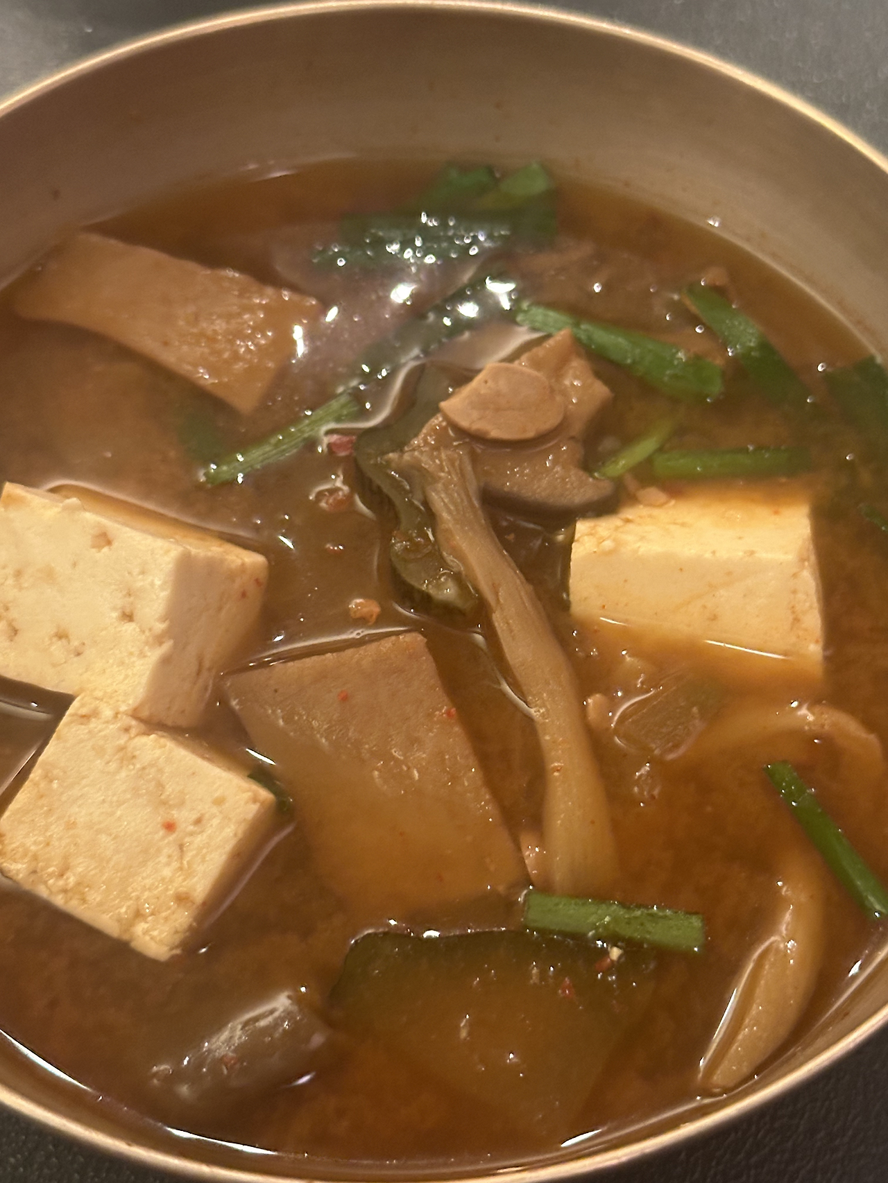 이제는 정겹게 느껴지는 카트의 덜컹거리는 소리와 함께 마지막 음식이 나왔다. 계란 후라이가 올라간 비빔밥과 버섯과 두부가 가득 들어간 된장찌개, 젓갈이 들어가지 않은 김치였다. 비빔밥에는 당근, 콩나물, 새싹채소, 버섯, 노각장아찌, 정체는 모르지만 맛있는 들깨에 버무린 나물, 그리고 마지막으로 잡채가 들어가 있었다. 원래 냉장고 속 재료들을 몽땅 넣어 비벼 먹는 게 비빔밥이므로 크게 이상하다고 느낀 비빔밥 속 재료는 없었지만 잡채가 들어간 것만큼은 독특하게 느껴졌다. 비빔밥의 고장인 내 고향 전주에서도 잡채가 들어간 비빔밥은 먹어보지 못했으니 말이다. 처음엔 갸우뚱했지만 맛을 보다 보니 이상할 것도 없었는데, 밥 위에 잡채를 반찬으로 얹어 먹는 것 같기도 하고 밥을 먹다가 면이 딸려 올 땐 면이 조금 남은 라면 국물에 밥을 말아먹는 것 같아 반가웠다. 된장찌개는 진하고 구수한 맛에 호박, 버섯, 부추, 두부가 가득 들어가 떠먹기도 하고 비빔밥에 넣어 비벼 먹기도 했다.
