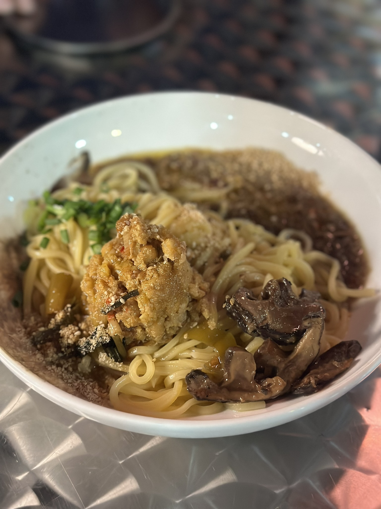 김치 한 접시를 다 먹고 추가로 주문한 접시가 나올 때쯤 고사리 들깨 비빔면이 나왔다. 고사리 오일로 요리했고, 병아리콩으로 만든 페스토를 위에 올렸다고 젊은 사장님이 설명해 주셨다. 과연 비빔면은 오일에 자작하게 담겨 있었고 면 위에는 병아리콩 페스토와 구운 버섯, 잘게 썬 쪽파와 참깨가 올라가 있었다. 언뜻 보면 건강한 재료가 올라간 피자 같기도 했다. ‘고사리가 맛이 있을까’ 궁금증 반, 의구심 반으로 맛본 음식은 예상보다 훨씬 맛있었다. 고소한 고사리 오일과 들깨 맛이 무척 좋았다. 면은 통통하고 쫄깃해서 씹는 즐거움이 있었다. 한입 맛볼 때마다 ‘너무 맛있다’를 외치면서 먹었다. 박군도 마찬가지였다.