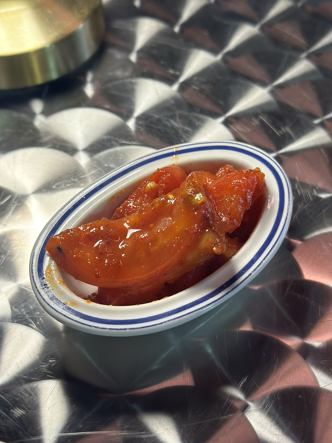 뭘 주문할지 한참을 고민하다가 고사리 들깨 파스타와 고사리 누들 떡볶이, 알배추구이를 주문했다. 고사리와 들깨, 고사리와 떡볶이, 맛이 상상되지 않아 더욱 궁금해졌다. 주문한 지 얼마 되지 않아 김치가 나왔다. 그런데 그냥 김치가 아니라 토마토 김치였다. 토마토를 적당한 크기로 썰었는데 한눈에 봐도 평소에 먹던 토마토는 아닐 것 같은 느낌이었다. 고춧가루가 군데군데 보였고, 평소에 본 토마토보다 더 불그스름한 게 확실히 김치 같았다. 맛을 보니 꽤 매콤했고 촉촉하고 상큼해 입가심하기 좋았다.