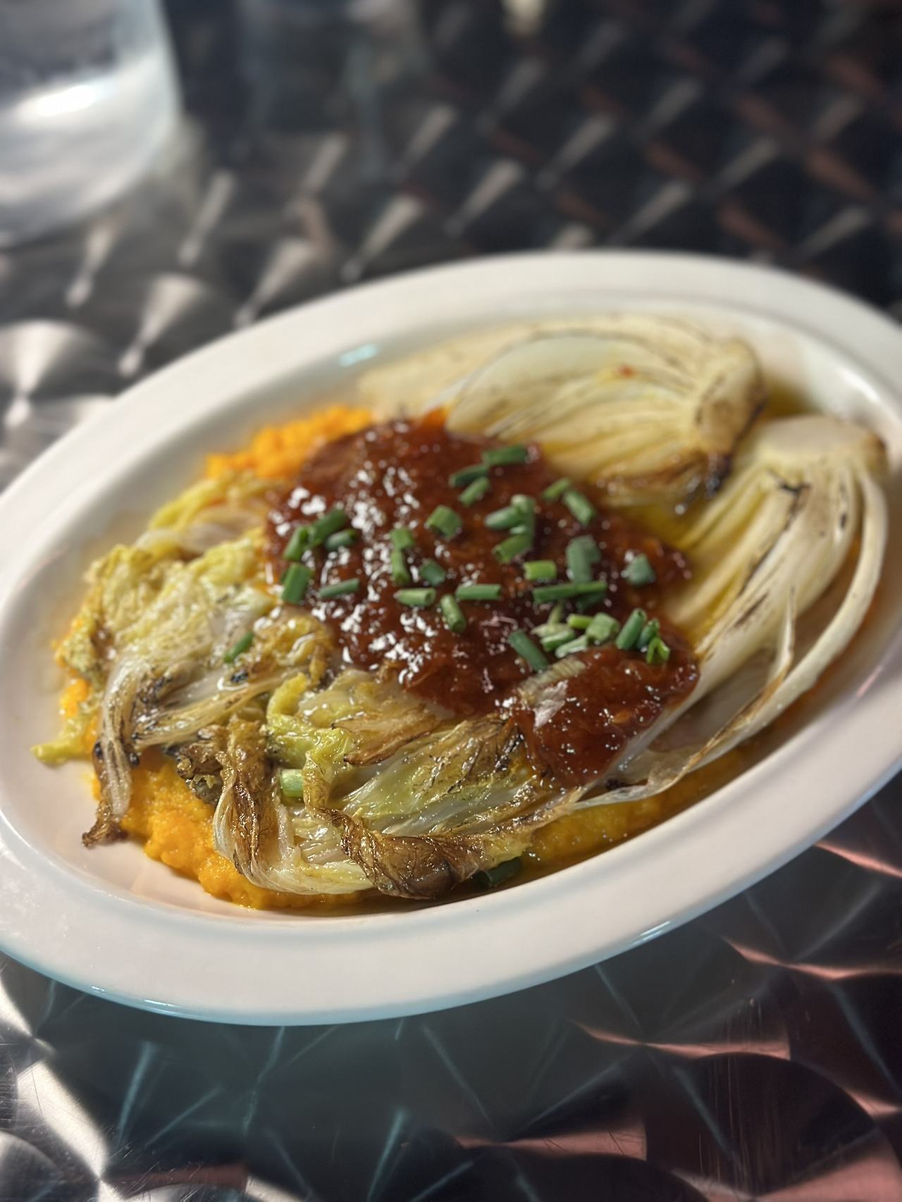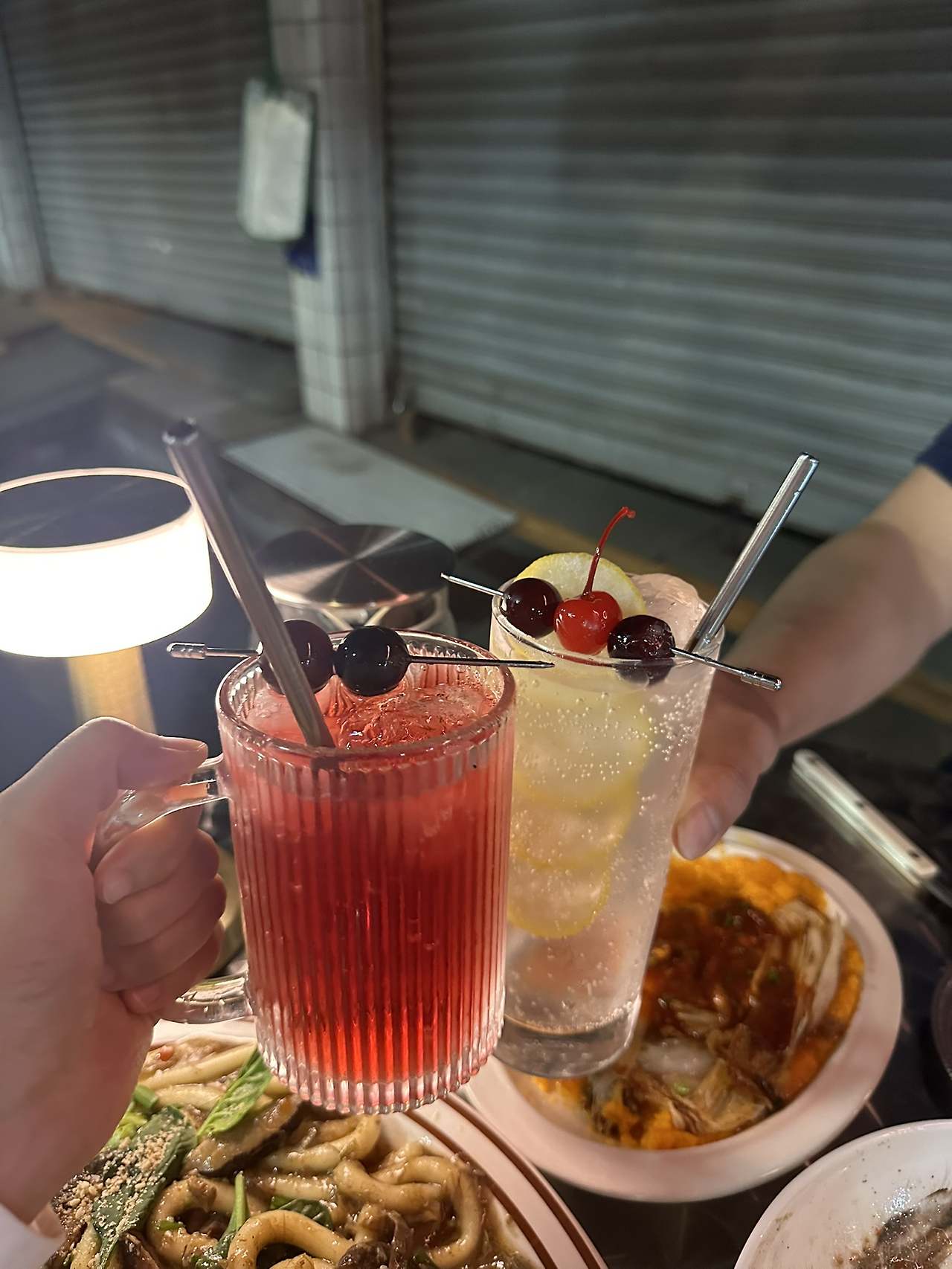 얼마 지나지 않아 양배추 구이도 나왔다. 당근을 으깨 만든 퓨레가 접시 맨 아래 깔려 있었고, 고사리 오일과 칠리로 만든 붉은 소스가 구운 양배추 위에 넉넉히 뿌려져 있었다. 역시 사장님이 설명해 주시기를 인기 메뉴인 당근 모모에 들어가는 소스와 동일하다고. 단호박과 같은 부드러운 질감에 은은한 단맛이 나는 당근, 촉촉하면서도 아삭아삭 소리가 나는 양배추, 그리고 매콤 달콤한 칠리소스, 세 재료의 맛이 조화로웠다. 계속 먹어도 잘 질리지 않는 맛이라 술안주로 먹기 좋을 것 같았다. 아, 우리도 술을 주문했다. 나는 복분자 스파클을, 박군은 토끼 하이볼을 주문했다. 음식과 함께 주문했지만 음식이 나오고도 절반 정도 먹고 난 후에야 술을 가져다주셨다. 손님 수에 비해 직원 손이 부족한 것 같았다. 그래도 기분은 좋았다. 맛있는 음식 때문이었는지, 친절한 사장님과 직원분들 때문이었는지, 그것도 아니면 불금이라는 사실 때문이었는지 모르겠다.