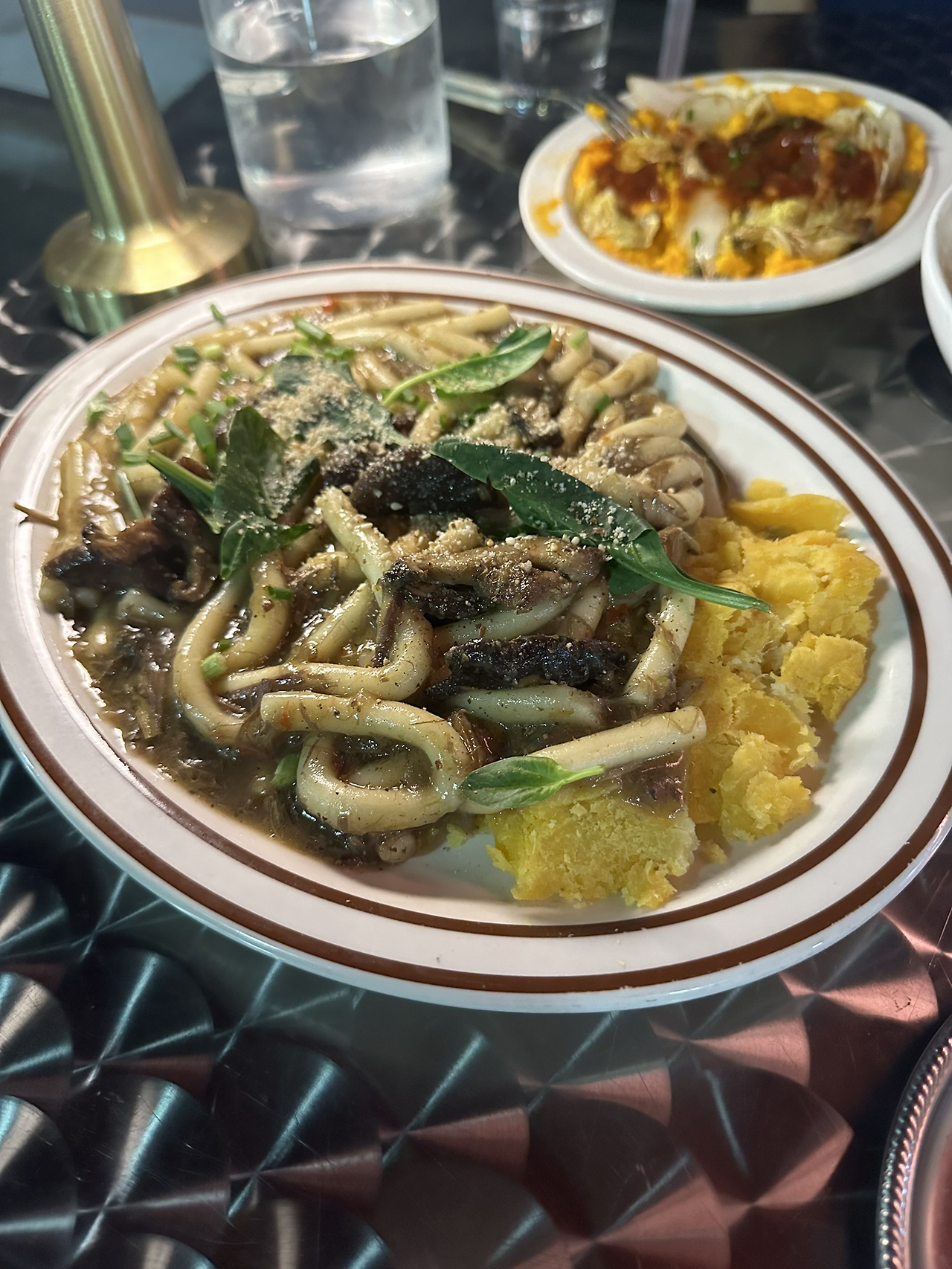 마지막으로 누들 떡볶이가 나왔다. 떡은 떡볶이라고 하기엔 얇았고, 그렇다고 우동이라고 하기엔 두꺼웠는데, 내 취향엔 아주 딱이었다. 면처럼 길어서 후루룩 먹기에도 좋았다. 듬뿍 들어있던 표고버섯도 쫄깃하고 간이 잘 배어 있어 씹을 때 맛있는 채즙과 양념이 새어 나왔다. 살짝 매콤하고 얼얼한 맛이 났는데, 음식을 다 먹고 계산할 때 사장님께 슬쩍 여쭈니, 알싸한 맛의 정체가 바로 고사리라고 하셨다. 고사리에서 이런 맛이 나다니, 놀라울 따름이었다. 감자를 좋아하는 나는 감자 퓨레가 같이 나온다고 해서 기대하고 있었는데 접시 위의 감자 퓨레가 색깔도 맛도 고구마라 혀에 문제가 생긴 건 아닌지 잠시 상심했지만, 역시 사장님께 여쭈니 고구마로 시도해 보고 계신다고 해 마음이 한시름 놓였다. (참고로 나는 별명도 감자다.)