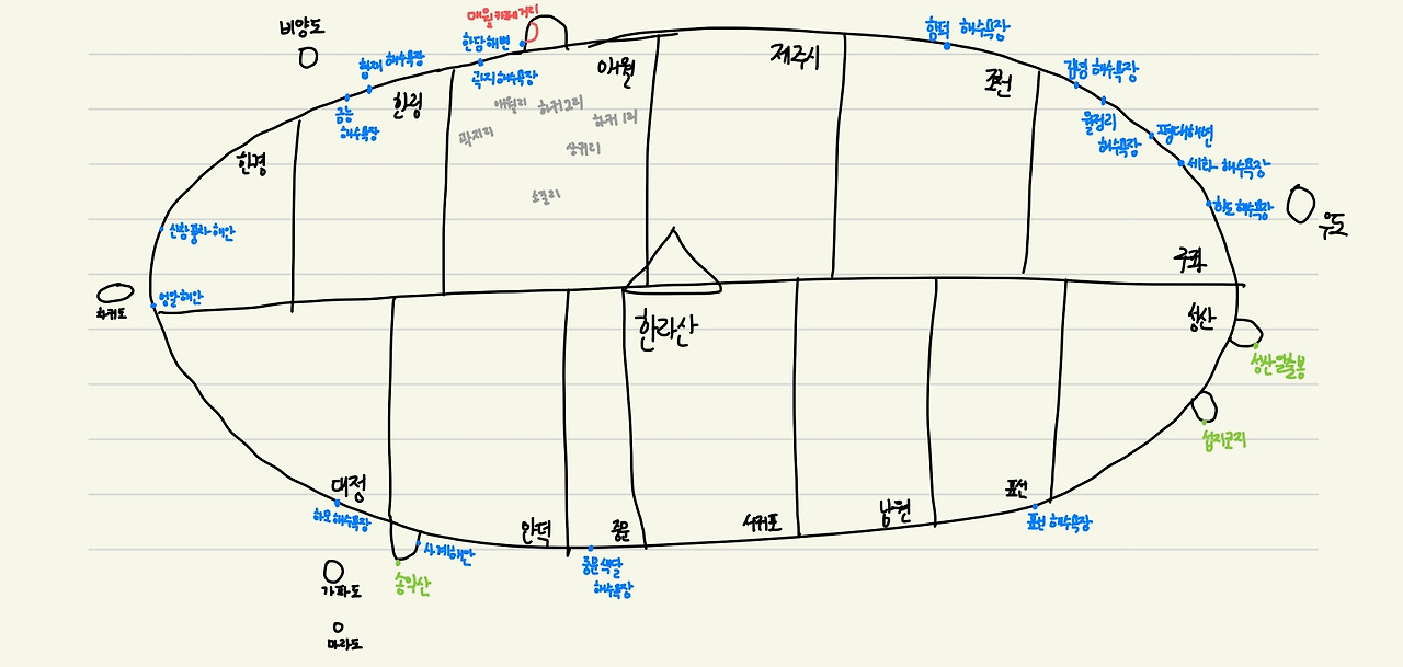 먼저 제주도 지도를 그려 보았다. 어디에 뭐가 있는지, 대략적인 지리를 알고 싶었다.