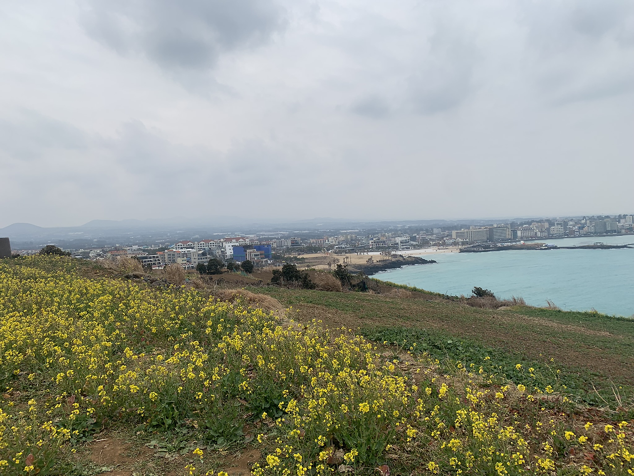 오전 9시 반이 조금 넘어 함덕에 도착했다. 서우봉 위에 피었다던 유채꽃을 보기 위해서였다. 함덕 해변은 보는 둥 마는 둥 지나치고 해변 옆의 서우봉 중턱에 올라 아직은 듬성듬성 피어있는 유채꽃을 배경으로 사진을 찍었다. 세화에서도 걷다 보면 저 멀리 밭에 핀 유채꽃을 볼 수 있었는데 이렇게나 가까이, 유채꽃밭 안에서 꽃을 바라보는 것은 처음이었다.
