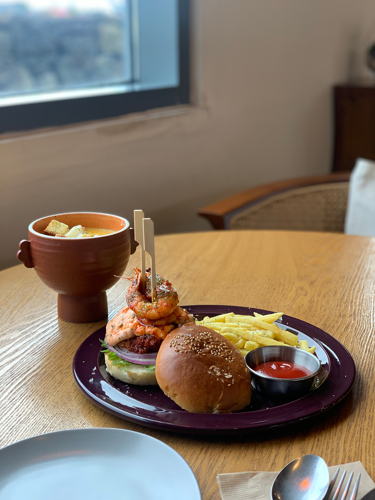 분명 아침에는 불어버린 몸을 체감하며 살을 빼겠노라 다짐했건만 눈앞에 놓인 음식을 보니 오늘도 양 조절에 실패했다는 생각이 들었다. 당근 수프는 고소하고 담백한 맛이었는데 '당근이 이런 맛이었던가?'하고 고개를 갸우뚱하게 했다. 새우버거는 양념치킨 맛이 살짝 도는 소스가 새우살로 만든 두툼한 패티와 그 위에 올라간 통새우와 잘 어우러졌다.