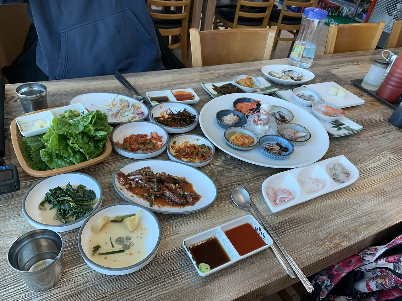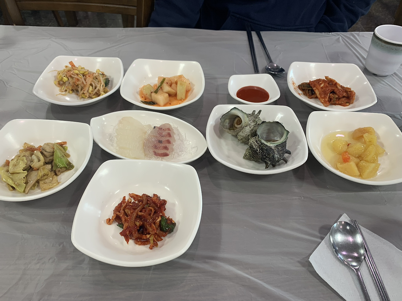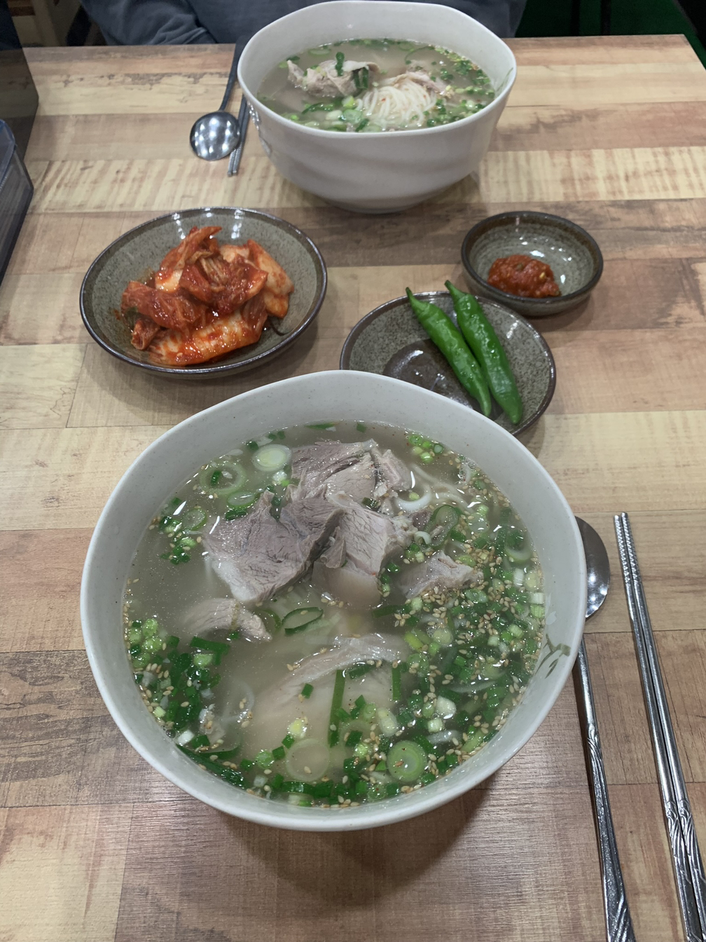 첫날: (아점) 우진해장국, 빈대떡, 막걸리, (간식) 우무 푸딩, 레몬차, 쿠키, (저녁) 제주 흑돼지