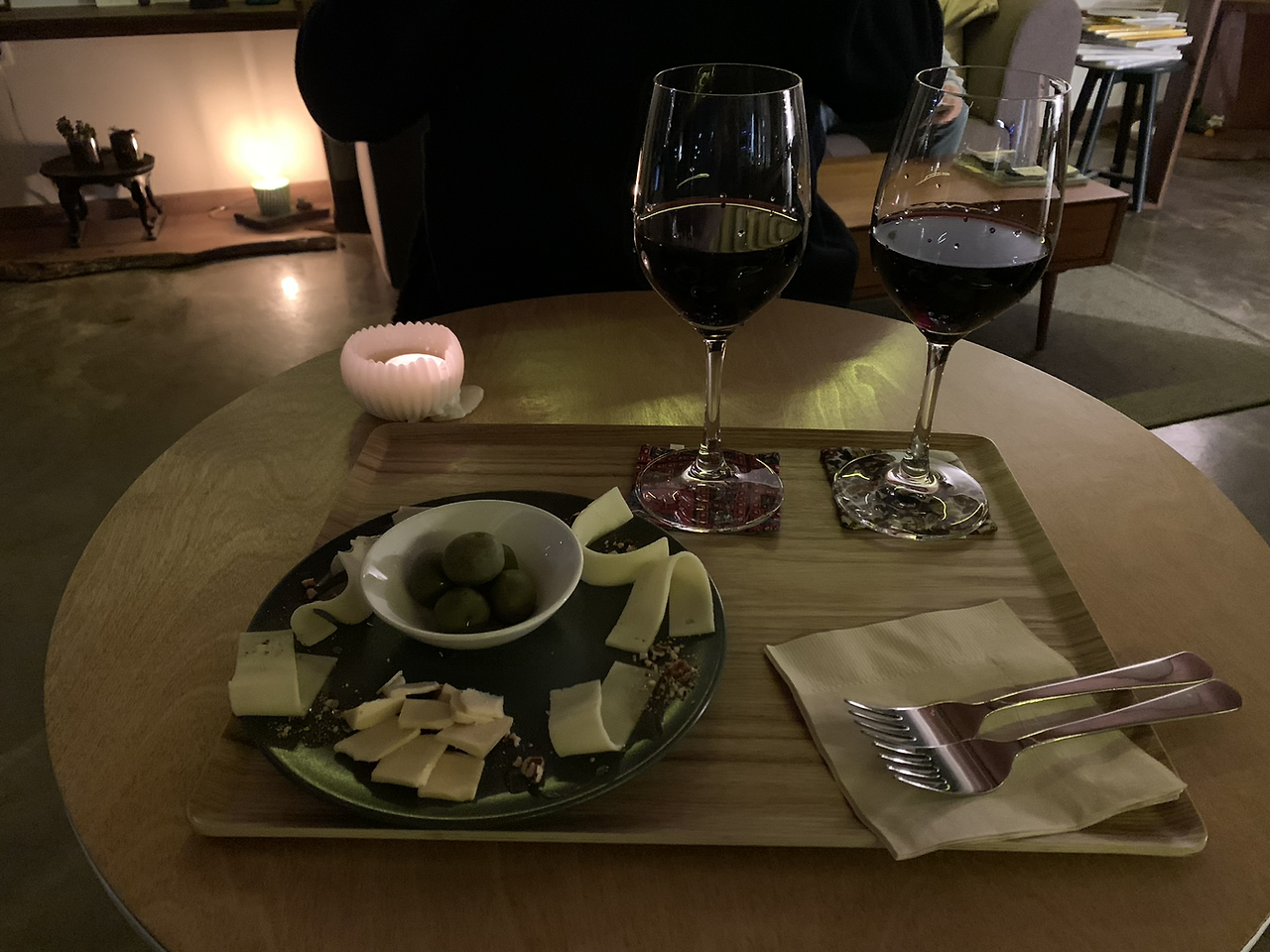 둘째 날: (아침) 토스트, 휘낭시에, 이름 모를 빵, 아이스 아메리카노, (점심) 전복가마솥밥, (저녁) 제육쌈밥, (야식) 와인, 치즈 플레이트, 올리브