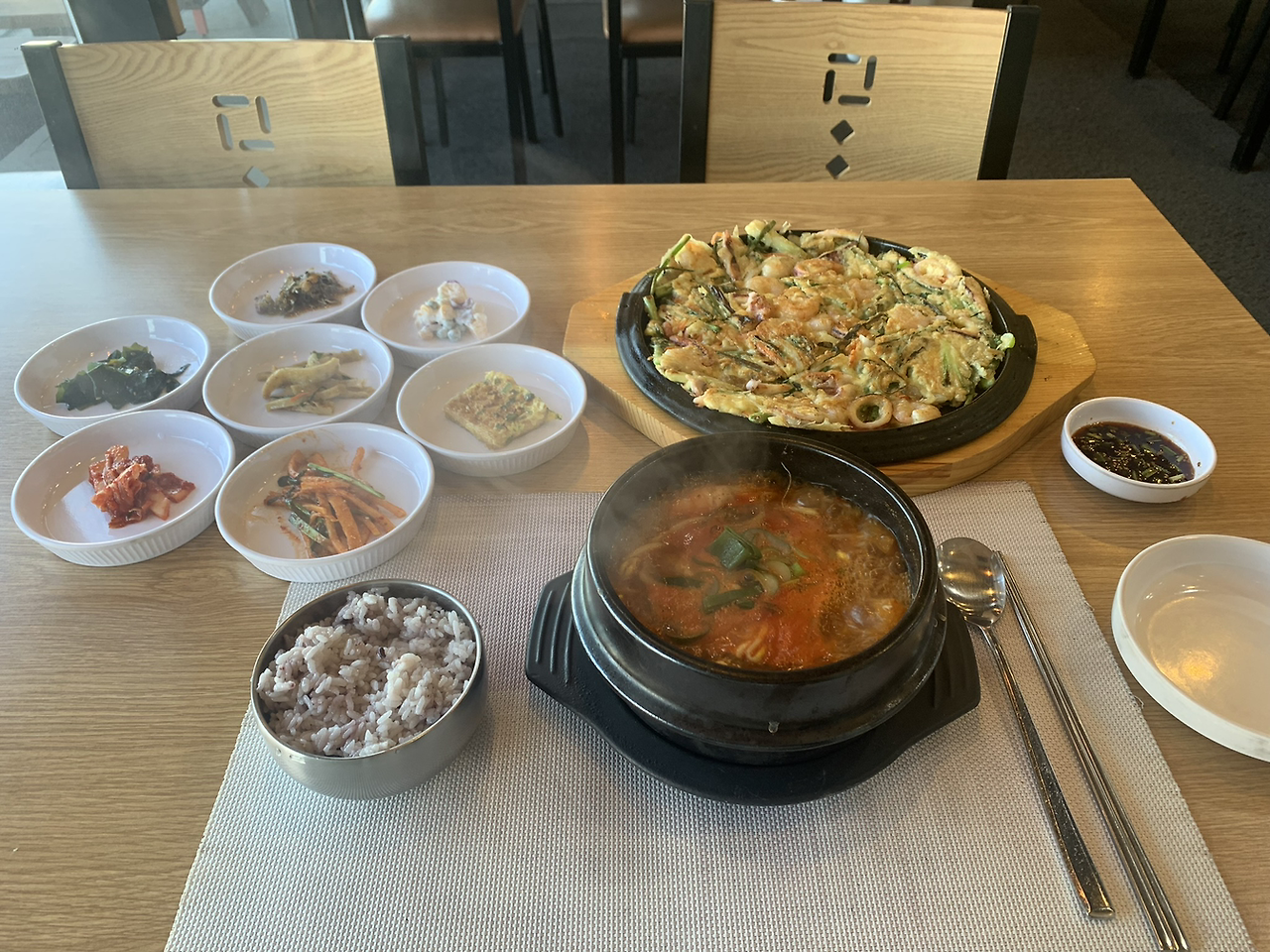 어제 호텔에 짐을 놓고 나와 호텔 근처를 한 바퀴 돌 때 발견한 음식점에서 아침 겸 점심을 먹었다. 해물 순두부와 해물 파전을 먹었는데 역시나 혼자 먹기엔 양이 많아 남긴 해물 파전은 포장해서 에코백에 곱게 넣었다.