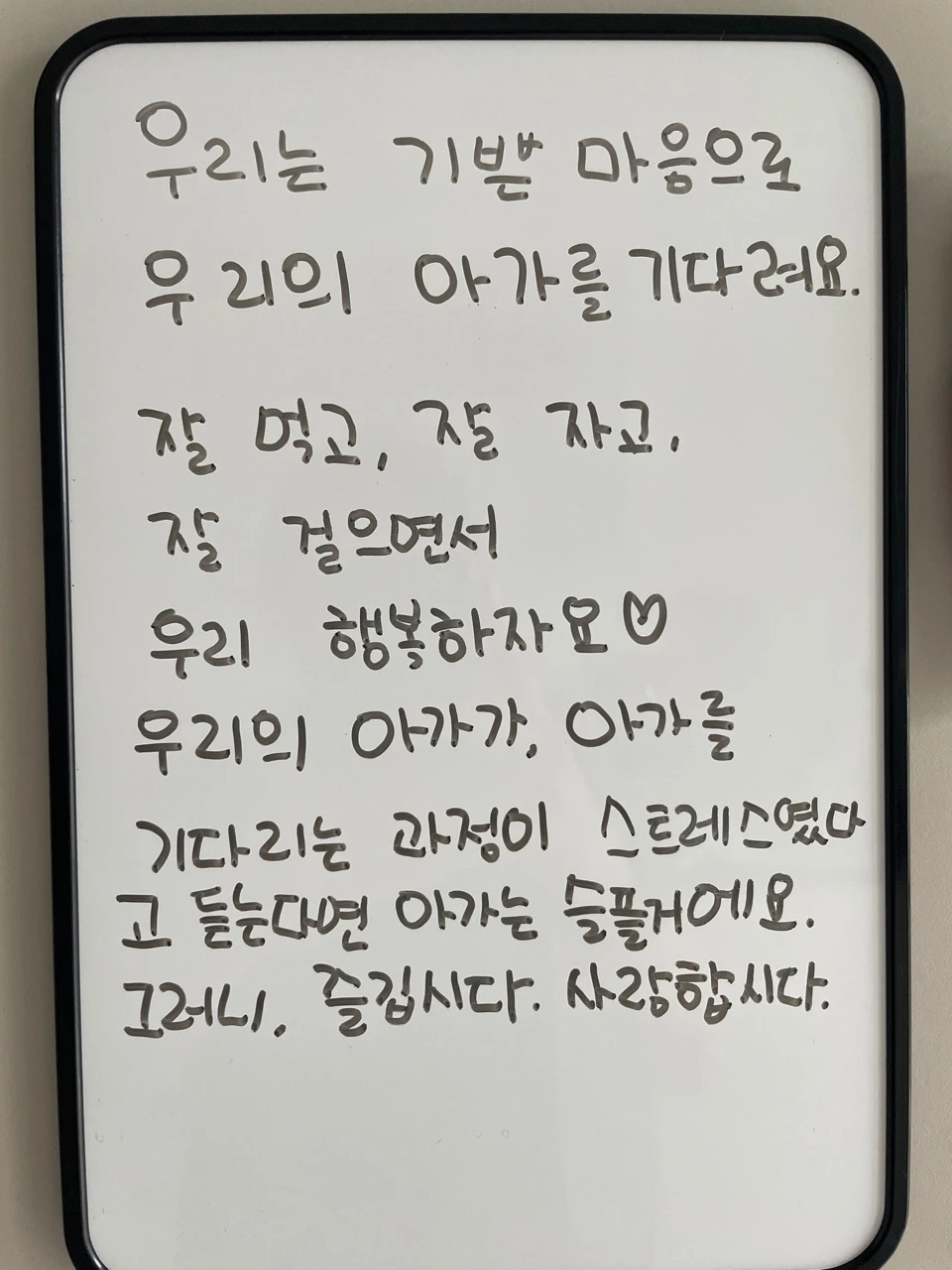 육아를 할 때 아이가 말을 듣지 않는다고 화내고 강제하기 보단 아이의 말에 귀를 기울이고 기다려주는 것 처럼 임신의 과정에도 조급함을 버려보기로 했다. 아이가 빨리 와주지 않는다고 너무 슬퍼하고 하루라도 우울해하는 일도 어쩌면 스트레스. 아이가 만약 아이가 오는 과정이 스트레스였다는 걸 듣는다면 아이는 무지 슬플거같다. 그래서 기쁜 마음으로 너가 오고 싶을 때 오렴 대신 엄마아빠는 육체적이나 정신적으로 더 건강해지는데 노력을 쏟고 사랑하고 있을게! 라는 마음을 갖기로 했다. 쉽지 않은 일 들에 그것을 이겨내는 과정이 이왕이면 기쁘면 더 좋을 것 같단말이지. 좀 더 어른이 되라고 아이가 천천히 오나봐