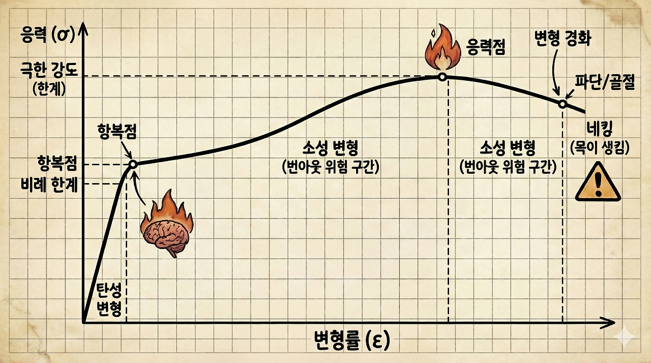 응력(나를 지킬수 있는 외부스트레스의 크기) > 항복점(내가 감당할 수 있는 힘) → 소성 변형 (번아웃)