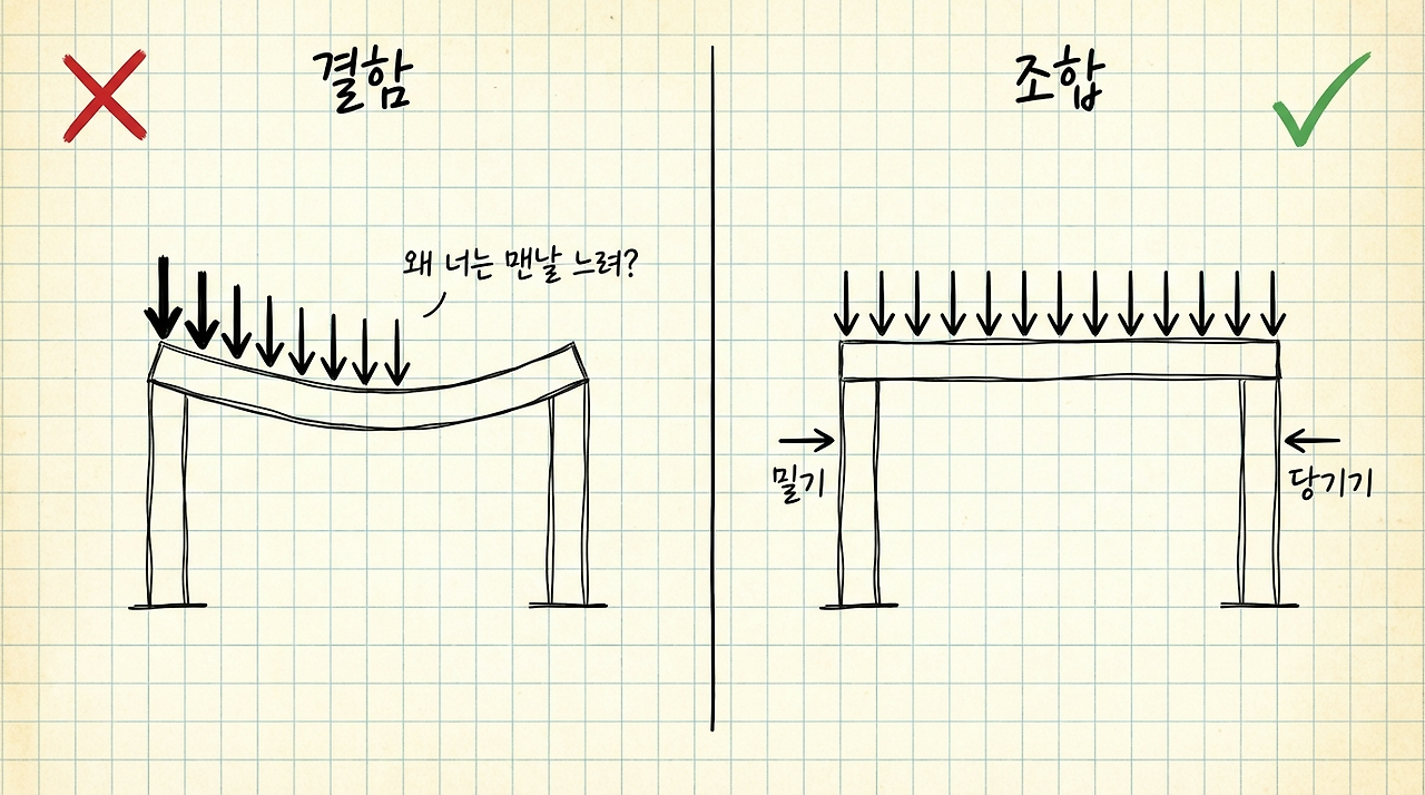 A4 용지를 떠올리십시오. 평평하게 펼치면 처지고, 접어서 각을 세우면 버팁니다.