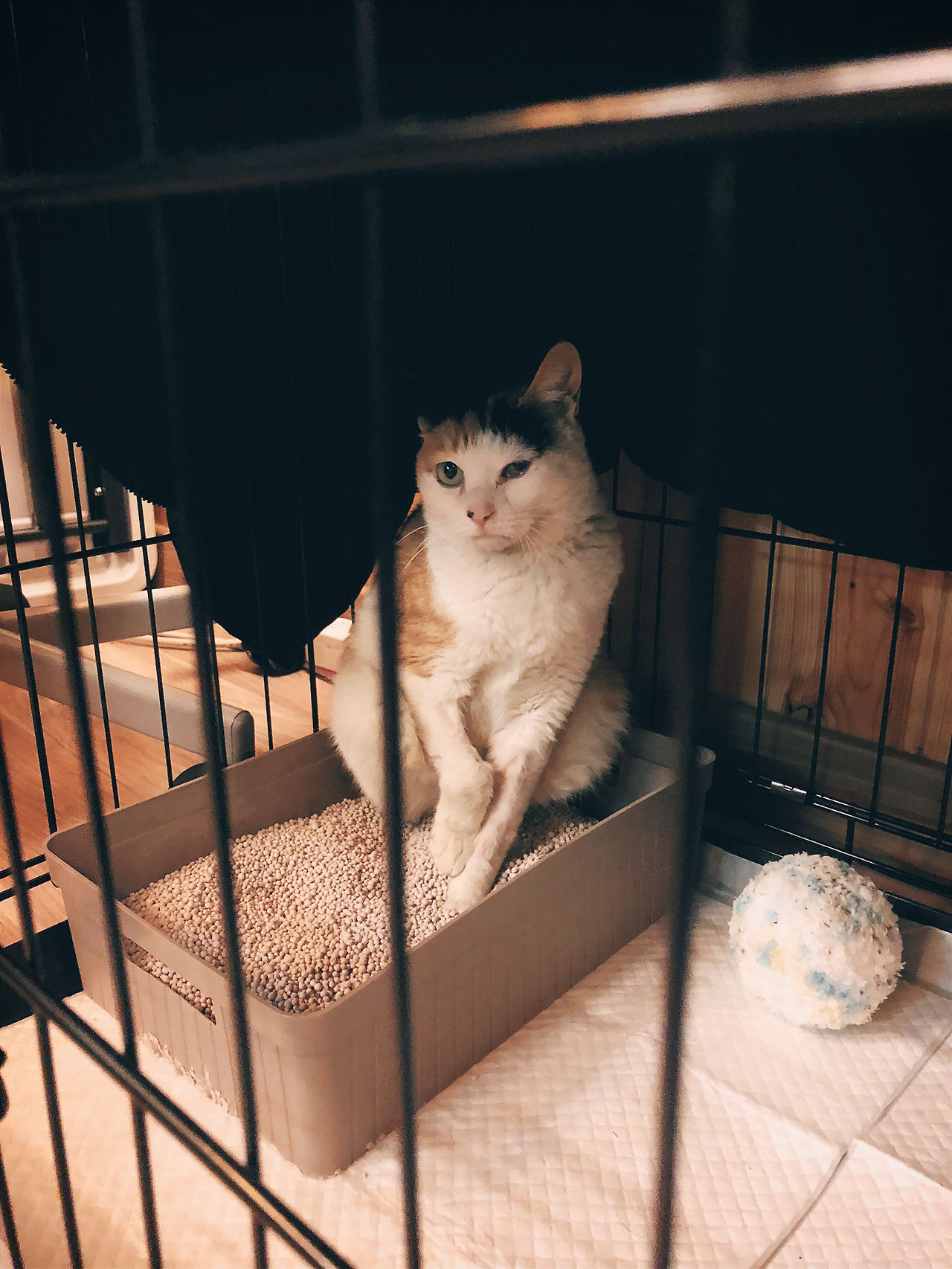 작업실에 온 삼색이는 사람이 있는 환경이 낯설고 무서워 처음에는 작은 케이지 구석에만 쪼그려 있었다. 밥을 주러 가도, 똥과 오줌을 치워주러 가도, 마치 자기는 그 자리에서 한 번도 안 움직였다는 표정으로 구석에서 쳐다만 보고 있었다. 사람이 있는 시간에는 움직이지도 않고 망부석처럼 가만-히 있다가 아무도 없는 저녁이 되면 그때서야 살금살금 움직이면서 일도 보고, 밥도 먹고, 물도 마시는 것 같았다. 고양이가 아무리 액체처럼 이리저리 유연하고, 자기 몸보다 작은 박스에 들어가 있길 좋아한다고 해도 하루 종일 그렇게 쭈그려 있으면 발 저리지는 않을지 걱정이 될 정도로 삼색이는 한 자리에만 있었다. 그 모습이 답답해 보이고, 배변패드와 같이 넣어준 모래상자에도 통 배변을 하지 못하는 것처럼 보여 좀 더 큰 케이지를 사서 연결해줘보았다. 밥과 화장실용 모래상자는 큰 케이지에 두고, 삼색이는 그대로 작은 케이지에 둔 채로 며칠 지내보았는데 삼색이가 얌전하게 새로운 환경을 잘 이용하는 것 같아 마음을 놓아버렸던 것이 문제였다.