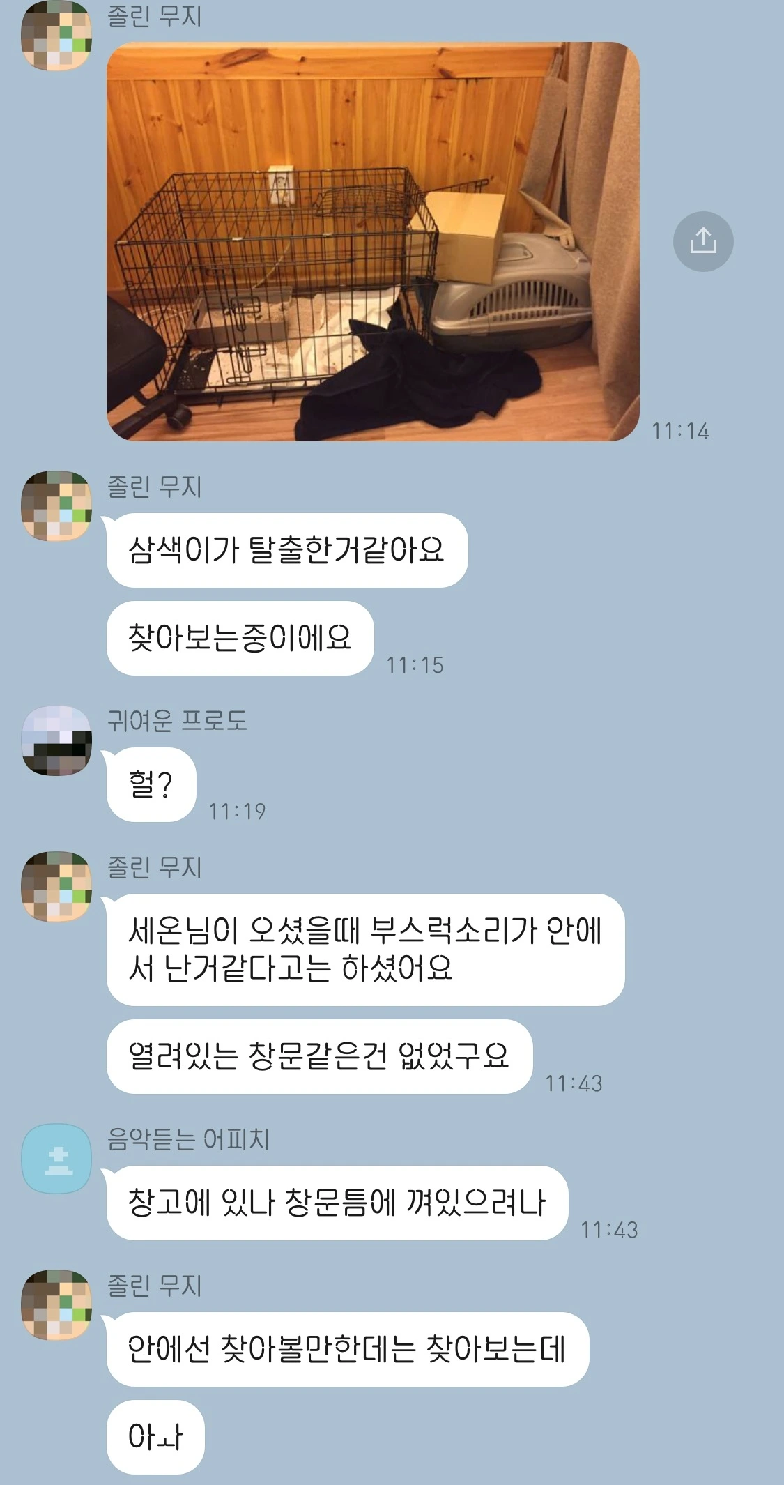 삼색이를 돌보다 잠시 라섹수술로 며칠 집을 비운 후 집에 돌아오던 날이었다. 아직은 살짝 불편한 눈으로 카톡을 봤는데 삼색이가 탈출을 했다는 메세지가 와 있었다.