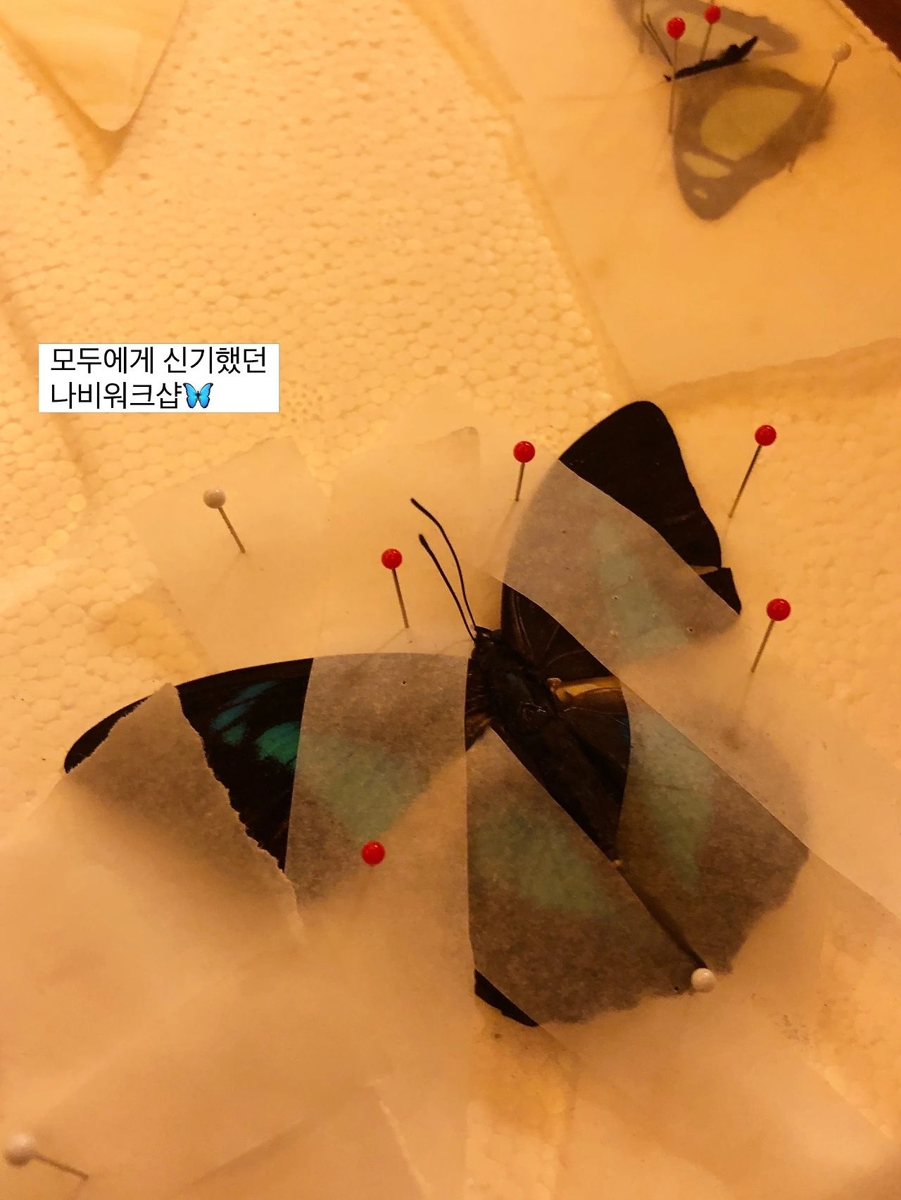 헬렌과의 인연은 코로나 때에도 이어졌다. 모두가 앞날을 예측을 할 수 없었던 2020년, 헬렌은 일본의 아트 레지던스에서 전시를 준비하고 있었다. 3개월을 예상했던 일본 일정은 코로나 때문에 기약 없이 길어져 9개월 정도를 일본에 있을 수밖에 없었다고 했다. 겨우겨우 미국으로 돌아가는 일정을 잡고, 코로나가 잠시 잠잠해졌을 무렵 서울에 와서 그간의 시간을 나누었다. 그때 헬렌은 나비와 풍뎅이를 활용한 작업을 하고 있었는데, 박제 워크샵을 우리와 함께 해보고 싶다고 했다. 아마존에서 배송받은 나비와 풍뎅이들을 물에 적셔서 조금씩 부드럽게 만든 후 조심스레 펼쳐서 핀으로 살짝살짝 고정했다. 나비는 살아남기 위해 겉날개는 나무색과 나무무늬를 가지고 있지만, 펼치면 총천연색의 화려한 무늬를 가지고 있었다. 곤충을 만지는 건, 그것도 죽은 곤충을 만지는 건 어렸을 때 이후 참으로 오랜만이었다. 조금 무섭기도 했는데 헬렌이 이 작은 생명의 시간들을 기억해 보자고 하면서 작은 의식처럼 이 박제작업을 하고 있으니 신비로운 느낌마저 들었다. 그날 우리는 오로라 타로 카드도 서로 나누고, 짧게 춤도 추었다. 헬렌이 있었기에 가능한, 헬렌의 에너지로만 가능한 시간이었다.