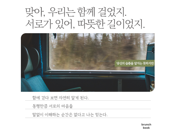 같은 목적지를 향해 함께 걷는 사람 사이에는 마법 같은 동질감이 있다. 한 사람이 힘들어하면 한 사람이 어깨를 내주고. 또 한 사람이 주저앉으면 다른 한 사람이 그 곁에 앉아 숨을 고르는 다정한 마음이 있다. 동질감은 이해에서 비롯한다. 함께 걷다 보면 자연히 알게 된다. 동행만큼 서로의 마음을 말없이 이해하는 순간은 없다고 나는 믿는다.