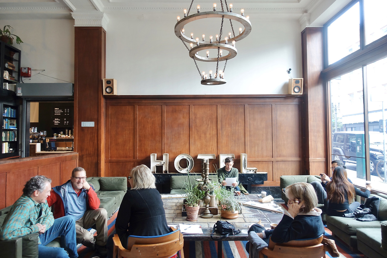 호텔에서 지내던 며칠간 로비에서의 경험은 포틀랜드가 더 좋았다. 에이스 호텔 포틀랜드 점은 스텀프 카페 바로 옆에 위치한다. 카페가 협소하기 때문에 사람들은 이곳 로비에서 스텀프 커피를 즐기기도 했다. 또한 포토부스도 함께 위치해 있어, 말 그대로 힙한 느낌이 가득했다. 스텀프 카페에서 테이크아웃을 해 2층의 숨은 공간에 앉아 있으면 로비가 내려다보여 여유를 즐길 수 있었다. 반대로 시애틀 점은 테이블과 안내 데스크, 정수기가 전부였다. 테이블도 안내 데스크 옆에 바로 위치해 있어 앉아서 여유를 즐기기엔 다소 불편한 느낌이었다.