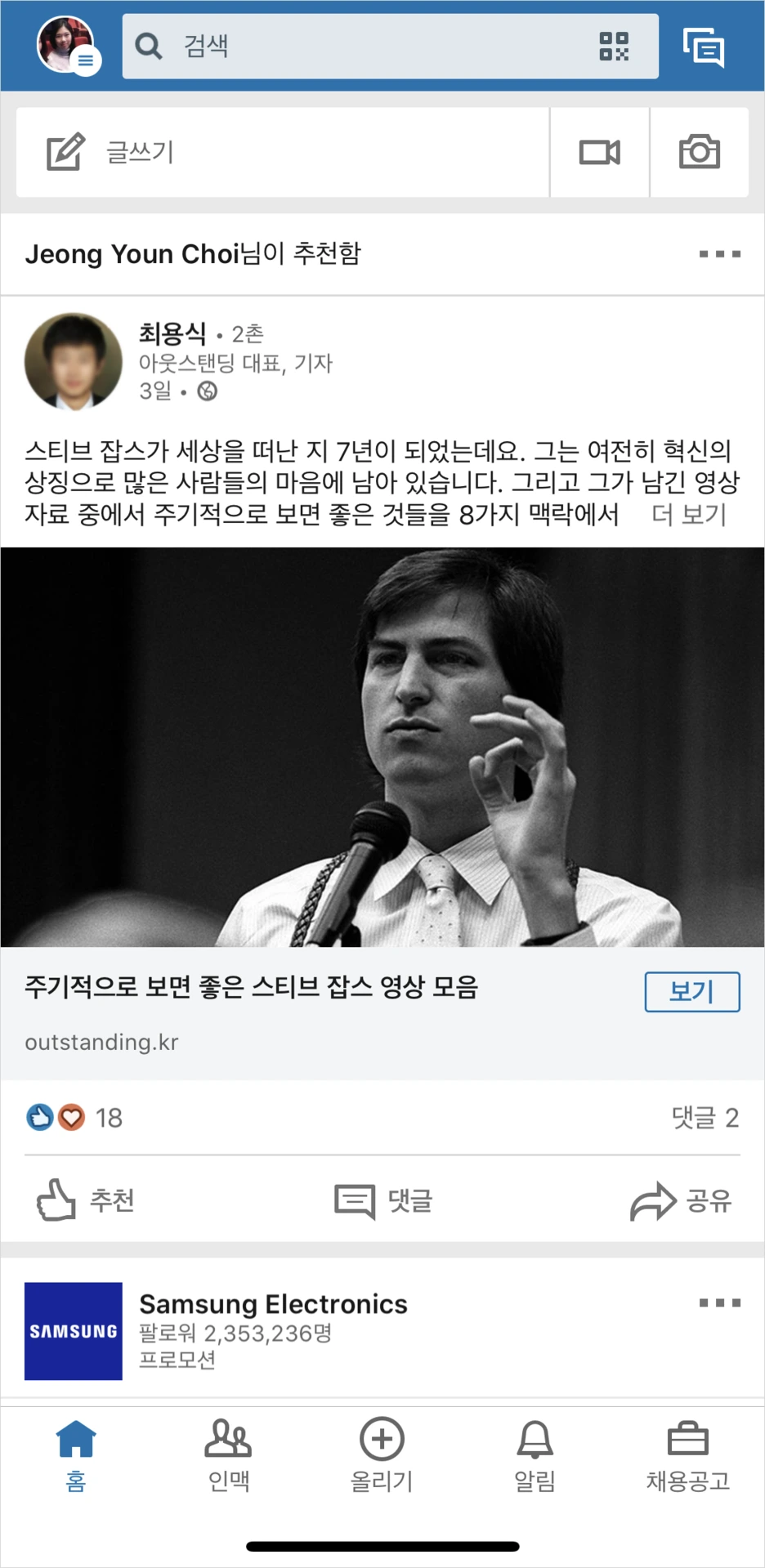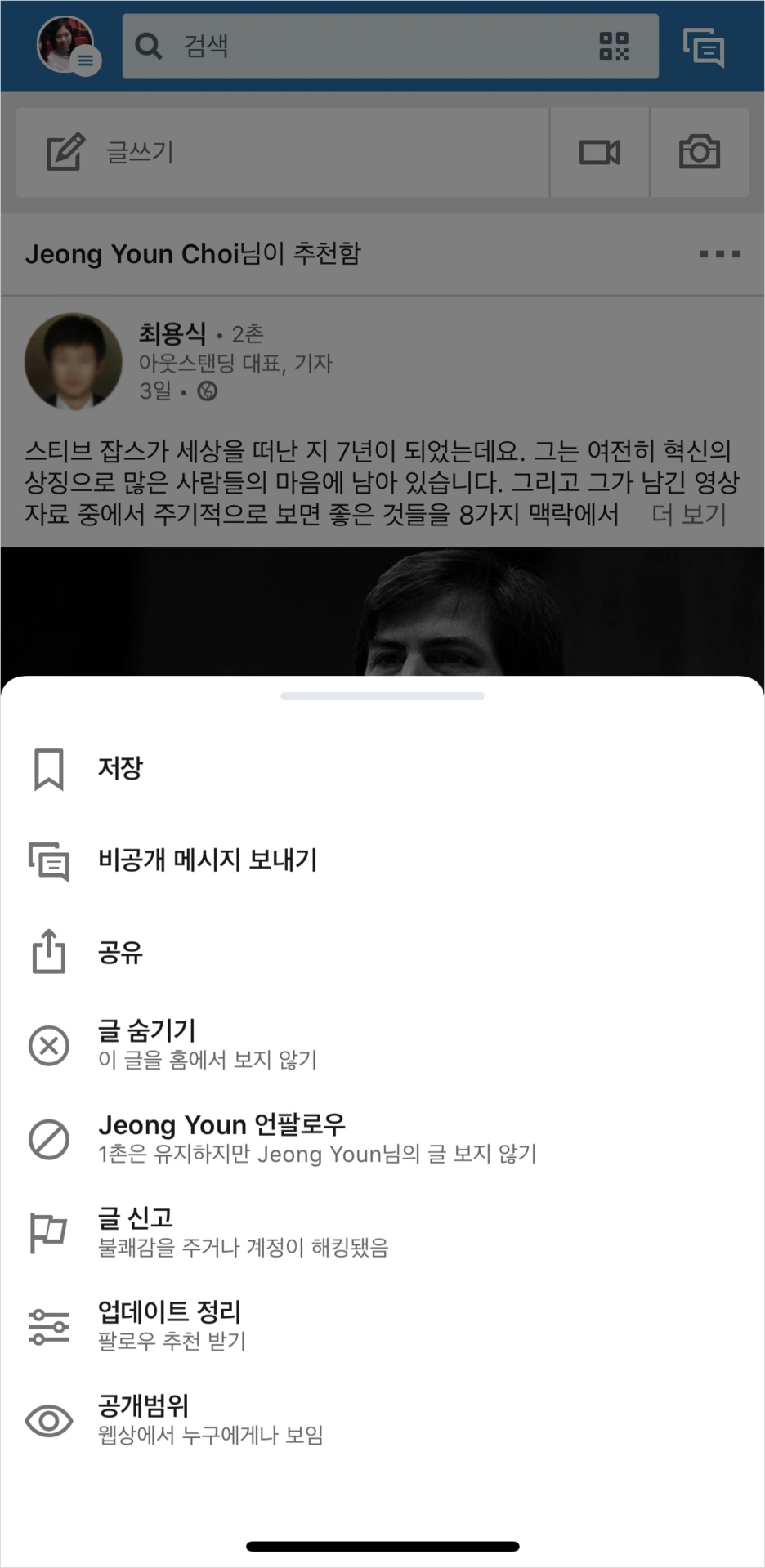 [공유]와 [전달] 기능을 다르게 제공하는 경우가 대부분이었지만, 하나의 레이블로 두 기능을 모두 제공하는 경우도 발견할 수 있었다. Linked in 모바일은 피드에서의 [공유] 메뉴와 더보기 > [공유]를 다른 플로우로 제공하고 있어 당황스러웠다. 피드에서의 [공유]는 앱 내부의 피드로 공유되는 형태로 위에서 언급된 [전달]의 의미로 기능이 제공되고, 더보기 메뉴의 [공유]는 외부 앱으로 전송하는 기능으로 작동되고 있다. 제공되는 아이콘이 달라 미세하게 차이가 존재하지만, 동일한 레이블을 사용함으로써 충분히 오해를 불러일으킬 수 있는 기능이라 생각된다. 이렇게 다른 기능은 레이블도 다르게 제공되어야 사용의 혼란을 줄일 수 있다.