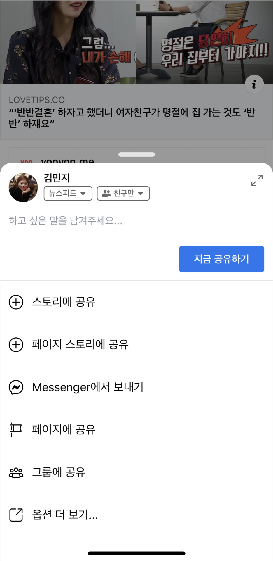두 기능의 가장 명확한 구분은 공유 대상을 언급하는 것이다. Facebook은 스토리나 페이지, 그룹 등 앱 내부로 공유할 수 있는 기능을 우선적으로 보여준다. '스토리에 공유', '페이지 스토리에 공유' 등 공유 대상을 명확하게 표시해줌으로써 사용자의 혼돈을 줄이고, 외부 앱으로의 공유는 [옵션 더 보기]를 선택하여 진행할 수 있도록 한다. 다른 예로, Instagram은 '게시물로 공유'와 '공유 대상(개인)'으로 레이블을 다르게 제공하여 해당 기능들 간 구분을 명확하게 주고 있다. 언급된 예시들처럼, 레이블이 표시될 영역이 확보된다면 [공유]나 [전달]을 애매하게 제공하기보다는 공유 대상을 명시하는 것이 가장 명확하고 혼란을 줄일 수 있는 방법이 될 수 있다.