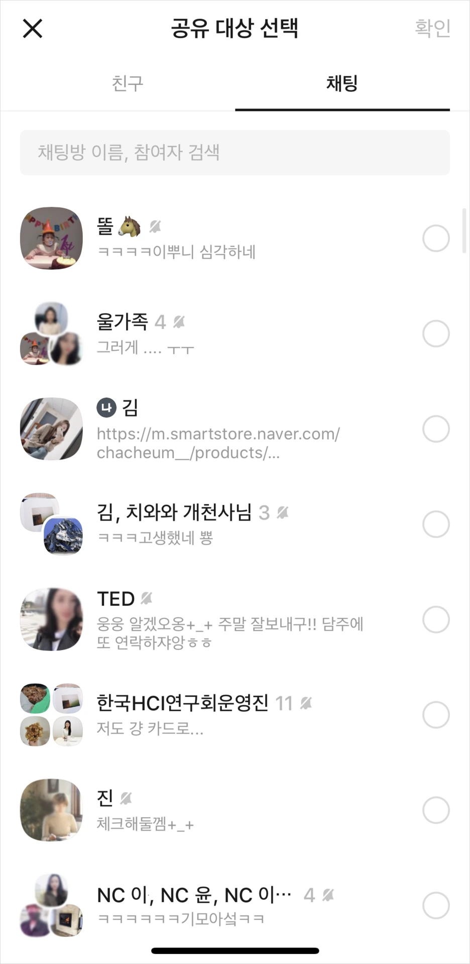 우선 국내 사용율이 높은 카카오톡을 살펴보았다. 카카오톡 PC에서 [전달]을 선택하면, 카카오톡 내 다른 대화방을 선택하는 플로우로 진행된다. 즉, 앱 내부에서의 메시지 전달인 것이다. [공유]는 다른 앱으로 보낼 수 있는 기능으로 제공된다. 두 기능이 헷갈릴 수 있지만, [공유]는 전송 가능한 앱 목록을 미리 보여줌으로써 헷갈릴 수 있는 상황에 대한 보완점을 제공하고 있다. 그러나 문제는 iOS 모바일이었다.