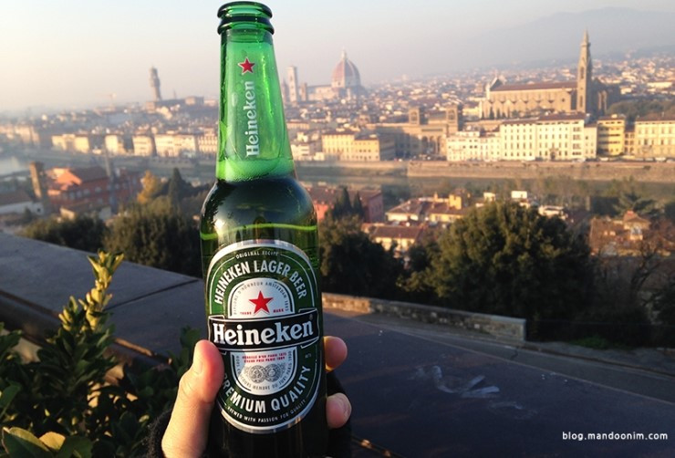 해질때 미켈란젤로 언덕을 올라오면 정말 좋을 것이라는 이야기를 들었다. 이곳에서 동행을 만나기로 하고 홀로 피렌체 시내를 돌아다니다가 이곳에 올랐는데, 해가 딱 지려고 할때 너무나 예쁜 풍경을 마주했다. Isn't she lovely를 부르고 있는 거리 예술가를 뒤로 하고 맥주 한병을 사먹는데 순간 너무 행복한 기분이 올라왔다. 원래 맥주를 그닥 좋아하지 않았는데, 이 때의 행복한 기분으로 인해 맥주를 참 좋아하게 되버렸다. 아마도 사람이란, 그렇게 기억에 의존하는 동물이 아닌가 라는 생각이 든다. 붉게 물들기 시작하는 하늘과 맞닿아있는 주황색 지붕들은 그 낭만을 더해주니- 피렌체에서 낭만적인 곳 중 한 곳이 아닐까.