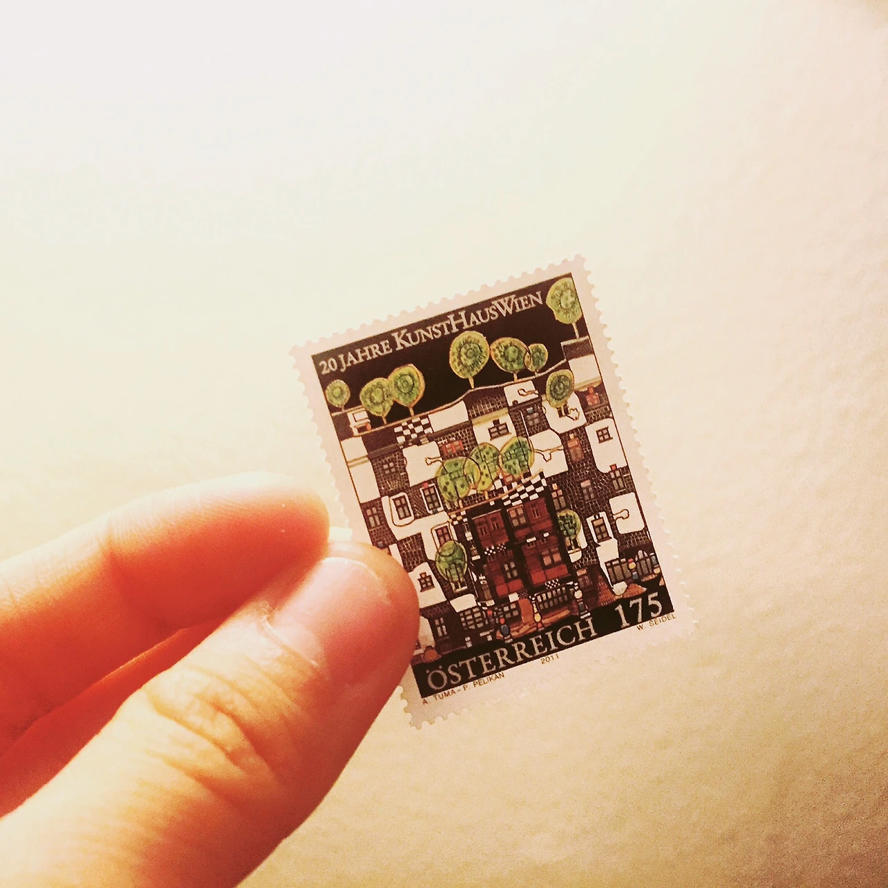 오스트리아 빈에서 가장 좋았던 곳을 누군가 묻는다면, 개인적으로 훈데르트 바서의 건축물 들이었다. 다른 곳들도 너무나 좋았던 빈이었지만, 그중에서도 사람도 한적하고 너무 예뻤던 이 건축물은 정말 잊을 수가 없다. 그 와중에 방문을 기념하고 싶어 고르고 골라 득템한 귀여운 우표. 그만의 스타일이 담긴 우표였어서 세트로 구매하고 싶었지만 너무나 비싼 금액에 경악을 금치 못하고 마음을 다잡고 나에게 보낼 엽서에 한장, 지인에게 보낼 엽서에 한장을 구입하였다. 너무 귀엽고 센스있는 그림에 개인소장을 안할 수가 없던 우표. 빈에 들릴 일이 있다면 구입할 것을 강력 추천한다.