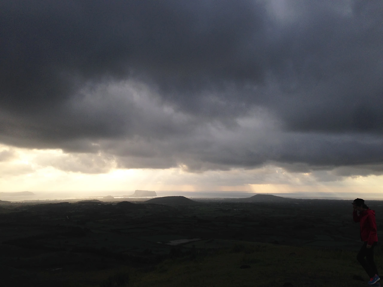 제주도 용눈이 오름에서 보는 일출이 정말 예쁘다고 했다. 밤새 술마시며 친해진 게스트하우스 사람들과 게스트하우스 주인 아저씨의 봉고에 타고 아침 일찍 기대를 품고 갔던 용눈이 오름. 그러나 우리를 기다리고 있던 것은 잔뜩 낀 먹구름이었다. 아쉬움에 아쉬움을 한참 내비쳤는데 서서히 개기 시작하는 먹구름 너머로 일출이 보이고 있었다. 저멀리, 마치 하늘을 가는 길처럼 보이는 햇빛이 너무나 예뻐서, 우리는 아쉬움도 던져버리고 한참 이곳에 앉아있었다. 실망스러웠지만, 예상치 못하게 만난 일출의 작은 반가움. 그때의 그 감동과 기분을 잊을 수가 없다.
