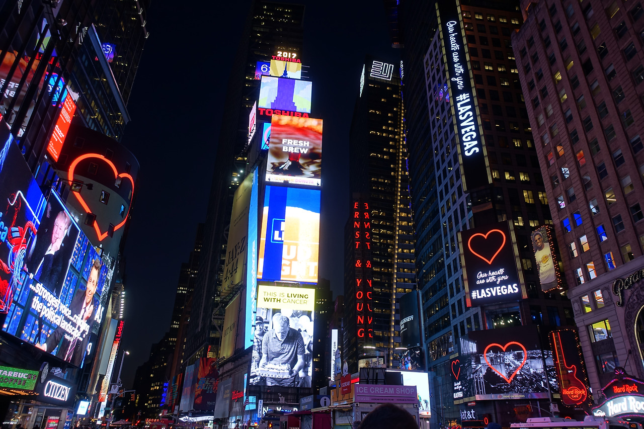 뉴욕하면 가장 떠오르는 이미지는 바로 화려한 전광판 가득한 브로드웨이 거리였다. 그러나 도착하자마자 만난 브로드웨이는 다소 아쉬움과 실망감이 있었다. 우선 사람이 너무 많아 복잡했고 전광판이 많고 화려하긴 하지만 기존에 다녔던 유럽과는 사뭇 다르게, 서울과 비슷한 느낌이 컸기 때문이다. 그러나 브로드웨이는 첫 인상보다 만날수록 더 좋았던 곳이었다. 복잡한 골목을 돌아다니다가 만나면 아는 곳을 만났다는 사실에 안도감을 느끼기도 했고, 눈에 익은 맥도널드나 지하철 표시마저도 반짝한 전광판이 '역시 뉴욕답다.'라는 생각을 떠올리게 만들었다. 마침 내가 있던 날 중에 라스베가스 총기사건이 있던 지라 전광판에는 Pray for Vegas 문구가 지속적으로 떠 있었다. 씁쓸했지만 나름의 추모 방식이기에 독특하긴 하다는 생각이 들었던 추억.