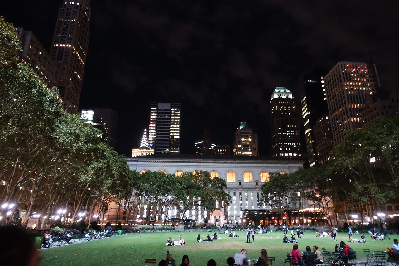 뉴욕에 도착했던 시간은 저녁이었다. 서둘러 맨하탄 시내로 들어와서 체크인을 하고, 막 퇴근한 의경이를 만났다. 고등학교 졸업 이후로 처음이니 10여년 만에 만난 듯 싶다. 그렇게 오랜 시간 후에 어엿한 사회인들이 되어 만나니 더욱 반가웠고, 유창한 영어를 구사하여 의지할 수 있게 된 의경이를 보니 대견하기도 했다. 그녀가 뉴욕의 첫 핫 플레이스로 날 데려간 곳은 바로 브라이언트 파크. 도착하자마자 피곤해서 걸어가자 했을 때 살짝 머뭇거렸는데 공원 입구에 들어서자마자 정말 '우아 멋있다!'라고 외칠만큼 너무 좋은 곳이었다. 늦은 시간이라 살짝만 머물러 있었지만 좀 더 이른 시각이었다면 맥주를 마시며 여유를 즐겨도 좋았을 곳. 뉴욕 시민들이 잔디에 앉아 여유를 즐기는 모습이 더욱 좋았던 곳이었다.