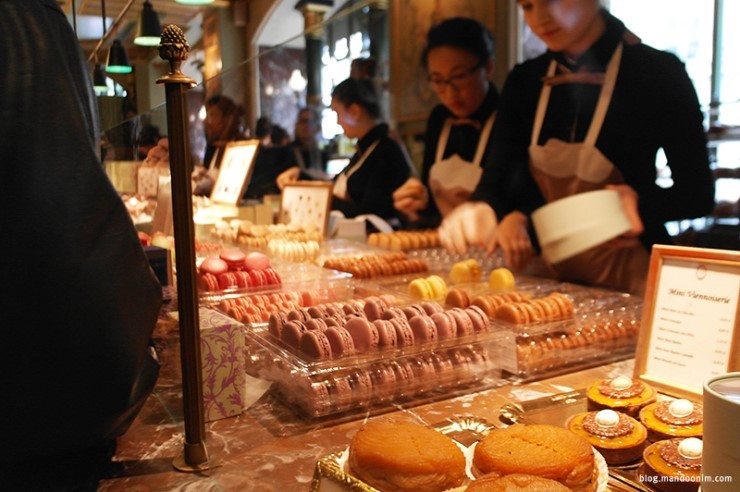 파리의 유명한 마카롱집 '라뒤레'에 쭉 서서 일하는 점원들. 점원이 이렇게 많음에도 불구하고 손님들로 가득 붐비던 곳
