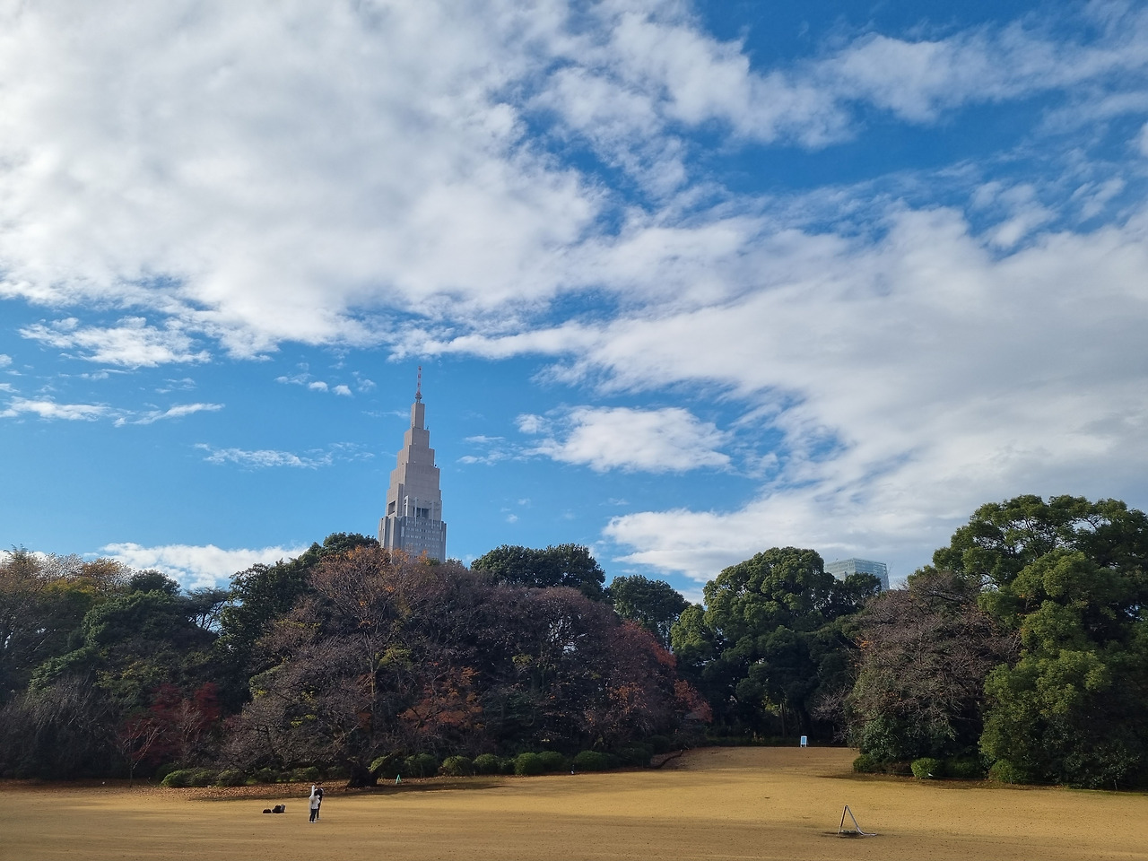 역에서 내려 공원으로 향하는 길에 찍은 사진. 중앙에 보이는 큰 건물은 신주쿠의 랜드마크다.