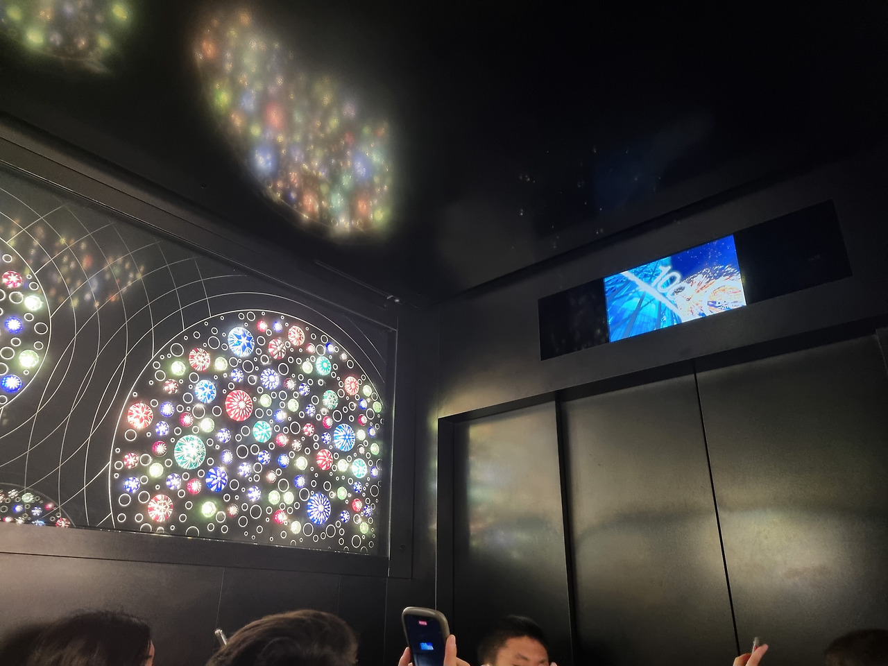 매표소에서 엘리베이터를 타면 첫 번째 전망대로 올라가는데 왼쪽 사진처럼 벽면의 디스플레이를 통해 영상을 틀어준다. 타워의 높이가 얼마이고 후지산과 비교해서 어떻고 막 불꽃 날아가고 펑 터지고 하는 그런 영상 말이다. 흥미롭기는 했지만 뭔가 익숙했다. 롯데타워에도 이런 게 있던가? 도착한 전망대도 솔직히 그렇게 막 대단하지는 않았다. 보는 방향에 있는 랜드마크를 보여주는 안내판이 있고 카페가 있고 포토존이 있고 그런 평범한 전망대였다. 그래 전망대가 뭐 이런 거지.