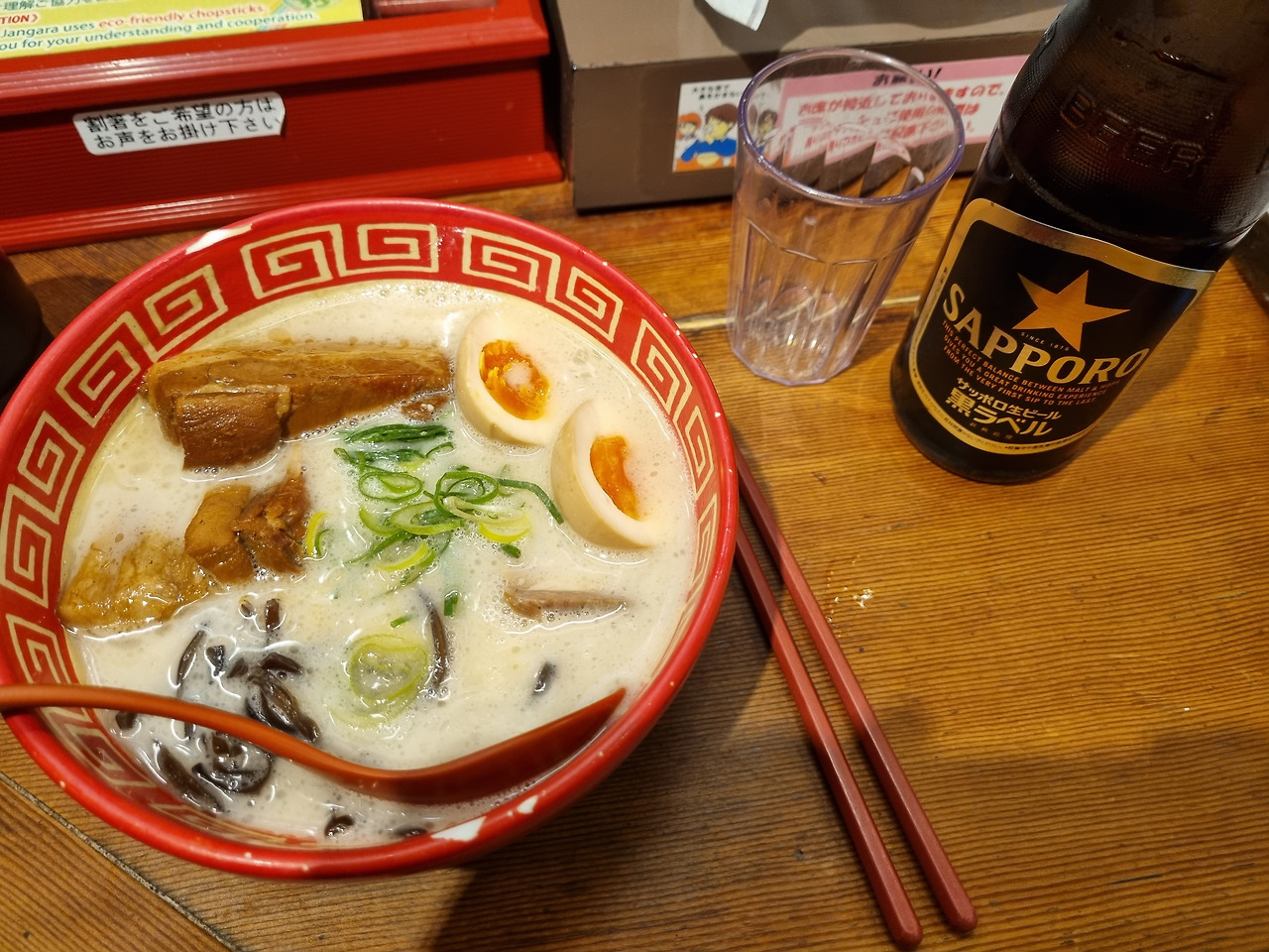 음식은 차슈멘에 토핑으로는 추가 차슈와 맛달걀, 음료는 병맥주를 시켰다. 주제넘게 맛 평가를 하자면 라멘의 맛은 평범했다. 맛이 없는 게 아니라 사람들이 기대하는 일본의 돈코츠라멘 하면 딱 이런 맛일 것 같았다. 체인점에 외국인 관광객을 상대로 해야 하니 강한 특색보다는 안정적인 맛을 추구한 느낌으로, 그게 나쁜 건 아니지만 특별한 걸 기대한 나한테는 조금 실망이었다. 그래도 일본 관광이 처음이라거나 너무 짠 걸 싫어하는 사람에게는 추천할만하다고 생각한다. 게다가 손님접대나 외국인에 대한 서비스도 괜찮아서 일본어를 전혀 모르는 사람은 오히려 좋을지도 모르겠다.