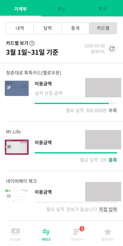 그래서 예전부터 계산한 내역을 나 대신에 시스템이 자동으로 남겨주면 좋겠다고 생각했다. 비단 나뿐만 아니라 많은 사람들이 같은 생각을 했던 모양이다. 요즘 온라인 가게부는 자동저장 기능이 기본적으로 내장되어 있다. 카드 결재 시 전송되는 문자 메시지를 인식하여 저장하는 방식도 있고, 아예 카드사와 연동하여 정보를 가져오는 방식도 있다. 결재 시의 정보와 자동 연동되므로 이제는 카드결재만 한다면 적어도 까먹어서 기록을 못하는 경우는 없게 됐다.
