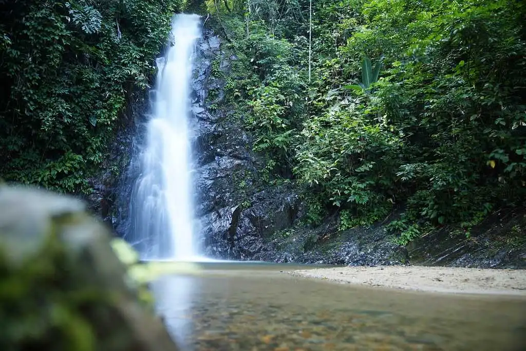 가장 가까운 곳은 구눙 라야 북쪽 기슭에 자리한 두리안 페랑인 폭포(Durian Perangin Waterfall)다. 정상에서 오토바이로 10분 정도면 도착할 수 있고, 입구에서 폭포까지는 계단식 트레킹 코스를 따라 10분 정도 가볍게 걸으면 된다. 폭포는 14단으로 구성돼 있는데, 상단까지 오르지 않더라도 중간중간 넓은 바위와 시냇물 구간에서 잠시 머물며 쉴 수 있다. 하류에는 발을 담글 수 있는 얕은 웅덩이도 있어 더위를 식히기에 좋다.