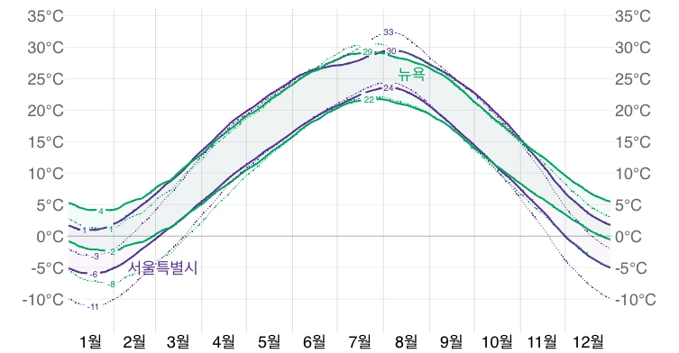 실제로 뉴욕의 겨울은 생각보다 춥다. 누군가 필자에게 뉴욕의 날씨를 물어보면 이렇게 답한다. 서울이 더우면 뉴욕도 덥고, 서울이 추우면 뉴욕도 춥다. 하지만 덥든 춥든 간에 서울보단 낫다고. 위의 웨더 스파크라는 홈페이지에서 비교한 서울과 뉴욕의 날씨 그래프만 봐도 두 도시가 상당히 비슷한 날씨 패턴을 갖고 있음을 알 수 있다. (습도 등의 차이로 체감적으론 더 격차가 느껴지지만)