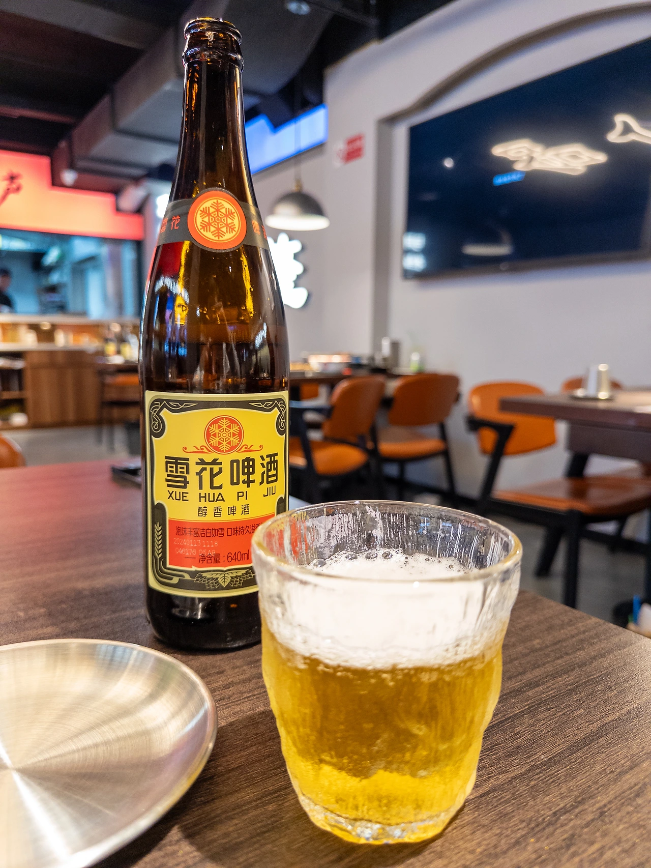마음 같아선 여러 가지 꼬치를 시키고 싶었지만, 주문 최소 수량이 있어 두 가지만 시켜도 1인분이 되었다. 결국 기본 양꼬치와 설화맥주 그리고 최애 메뉴인 부추 꼬치를 시켰다. 주문하자마자 종업원이 맥주를 바로 갖다주었다. 중국에서의 맥주는 예상대로 미지근하다. (중국인들은 차가운 맥주가 몸에 안 좋다고 안 마시는 경향이 있다)