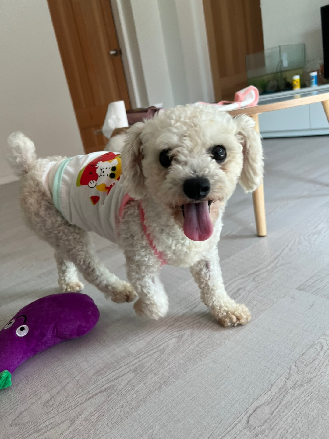[환한 미소를 짓고 있는 이 비숑은 병원에서 치료를 받고 좋은 집으로 입양을 간 케이스이다. 입양을 간 곳에서 사랑받고 잘 지내고 있다고 보호자분이 사진을 보내왔다.]