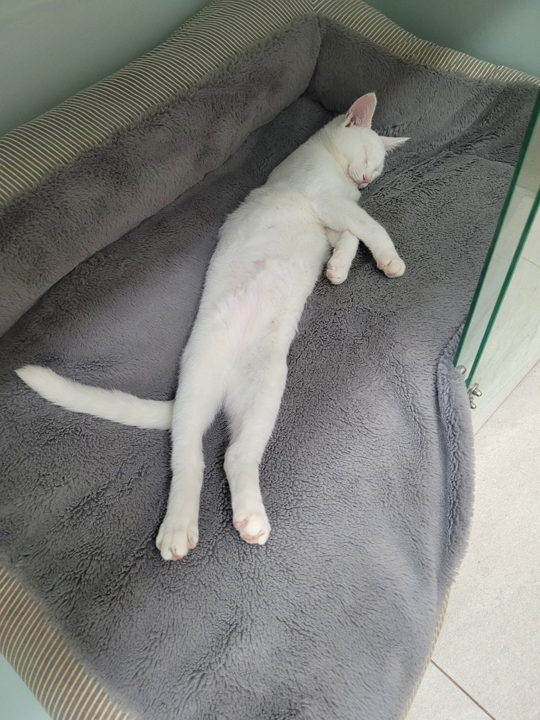 [수리는 머리에 큰 상처가 있어서 입양을 못 갔지만 누구보다 병원생활을 즐기는 아이이다. 어제 술을 드셨는지 쿠션 위에서 몸을 쭈욱 펴고 쿨쿨 주무시고 계시다. 너무 사랑스럽다.]