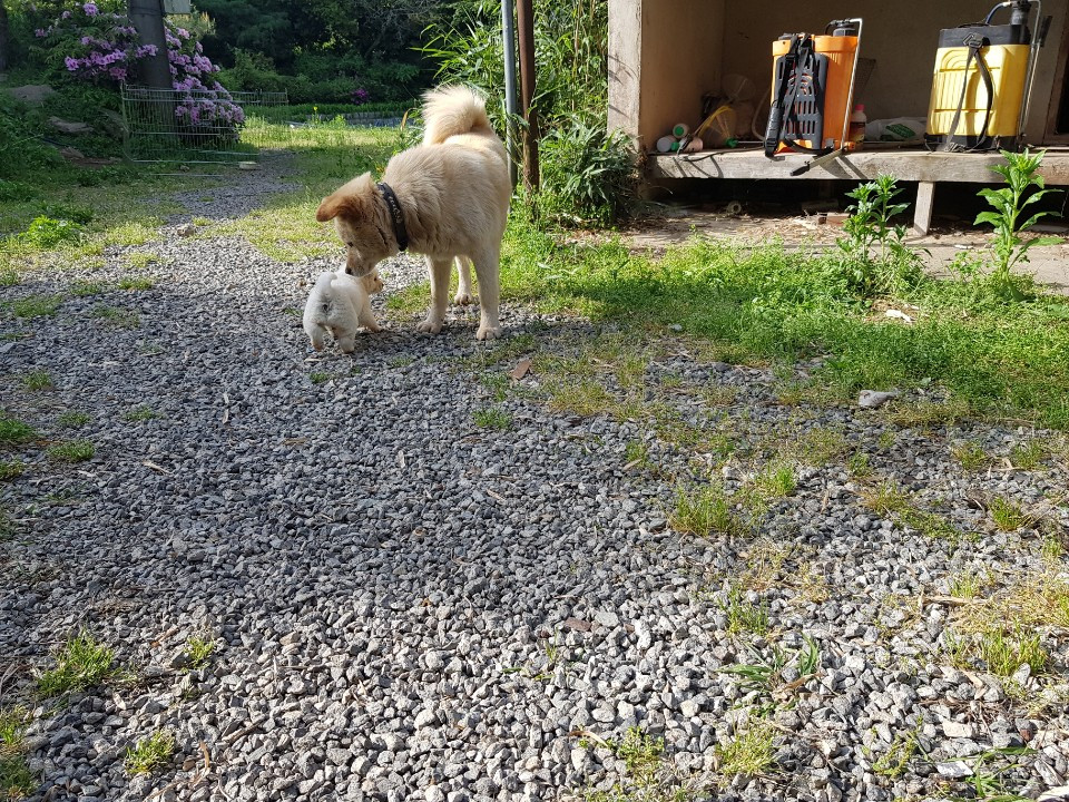 행복이가 조심스럽게 아기의 냄새를 맡고 있다. 새끼는 겁도 없이 그런 행복이한테 자꾸 다가간다.