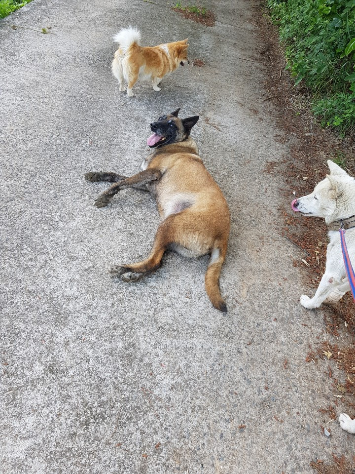 편백이가 산책하다 너무 기분이 좋아 드러누워 버렸다. 편백이는 기분이 좋으면 곧잘 드러누워 만져달라고 나를 쳐다본다. 사랑스런 편백이다.