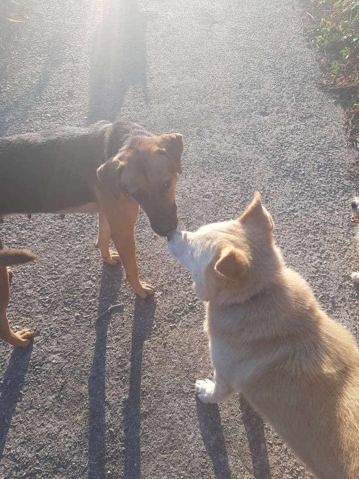 행복이 코에 뽀뽀하는 예복이, 예복이도 목에 둘러져 있던 쇠사슬때문에 상처가 났었다. 치료 후에 우리 집에서 키우게 되었다.