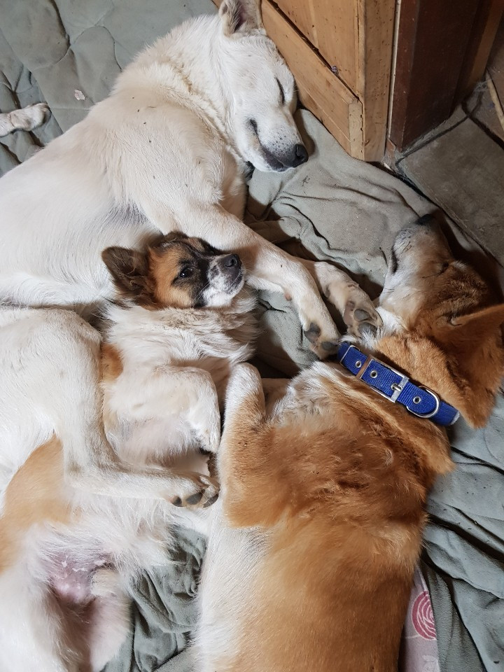 집 앞에 버려져 있었던 사총사 중에 복일이와 복삼이. 그 사이에 별복이가 껴있다. 쿨쿨 잘도 잔다.