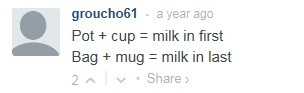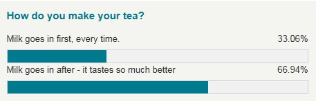 이렇게 무심히 시크하고 일상적인 영국의 밀크티 문화에도 나름 그에 대한 애정을 엿볼 수 있는 논쟁이 있는데 바로 '우유 먼저 - MIF (Milk In First)'와 '우유 나중 - MIA (Milk In After)'이다.