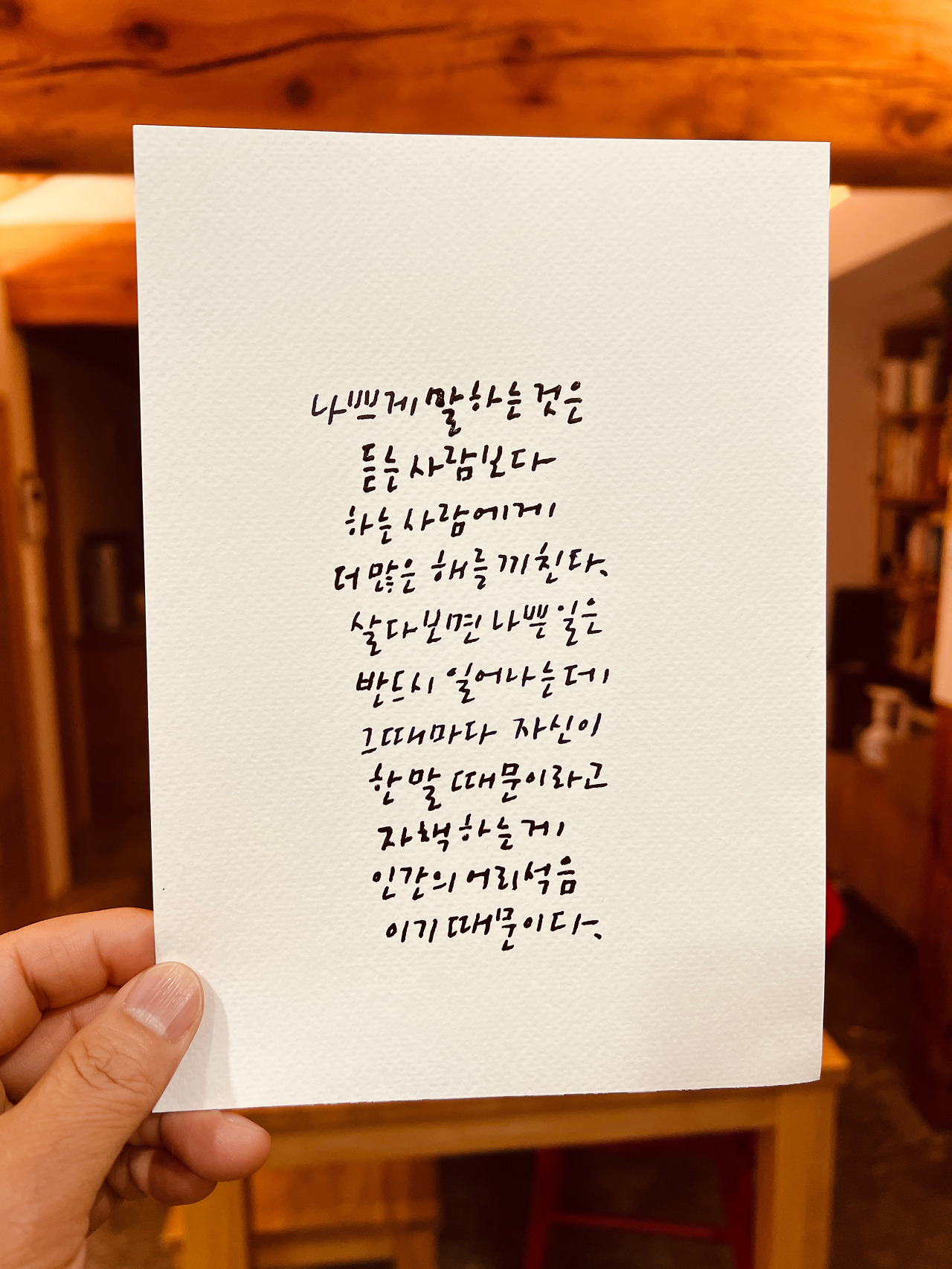 나쁘게 말하는 것은 언제나 안 좋다. 왜냐하면 그런 언어들은 그걸 들은 사람보다 그 말을 한 사람에게 더 안 좋은 영향을 끼치는 것 같기 때문이다. 살면서 누구에게나 나쁜 일은 일어나게 마련인데 그때 제일 먼저 생각나는 게 '말이 씨가 된다'는 속담이다. 우연히 일어난 일도 내가 그렇게 말해서, 아니면 누군가 그렇게 말하는 걸 들어서 그 일이 일어났다고 생각하게 되는 것이다. 그게 사람의 본성인 것 같다. 어떤 일이든 원인이 있다고 믿고 싶고, 누군가에게 책임을 지게 하고 싶어지는 심리 말이다.