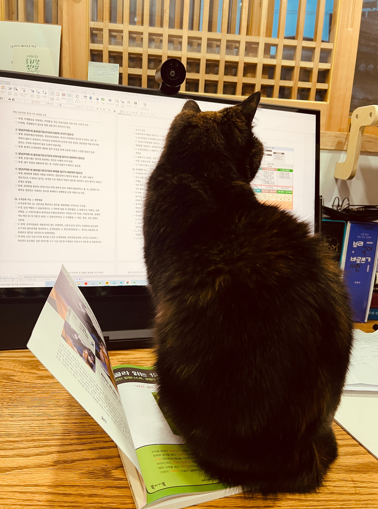 기획회의를 읽다가 다시 인스타그램에 들어가 김영하, 김금희 관련 글들을 검색해서 읽었다. 김금희 작가는 독서를 하는 사진 밑에 달린 '아름답습니다'라는 팬들 댓글들에 "아이쿠, 고맙습니다."라며 쑥스러워하고 있었다. 나도 김금희 작가의 팬이라 댓글을 달고 싶었지만 새벽에 너무 광적인 글을 달면 작가가 무서워할까 봐 참기로 했다. 스마트폰을 놓고 다시 책상 쪽을 바라보니 고양이 순자가 기획회의를 깔고 앉은 채 모니터를 턱 가로막고 있었다. 도대체 뭘 하자는 건가.