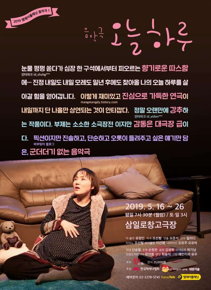 사는 게 각박해지고 국정농단까지 겹치는 바람에 겨울이 와도 크리스마스 기분이 안 나는 건 꽤 오래되었지만 그래도 이맘때쯤엔 연극이나 뮤지컬을 꼭 한 편 보고 지나가자고 약속했었다. 그래서 올해도 아내는 크리스마스이브에 맞춰 창작 뮤지컬을 하나 예매했다. 유정민 작가가 극본을 쓰고 연기도 하는 일인극 뮤지컬 [오늘 하루]다.