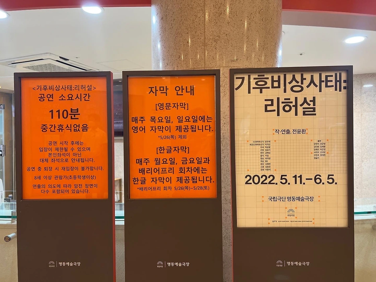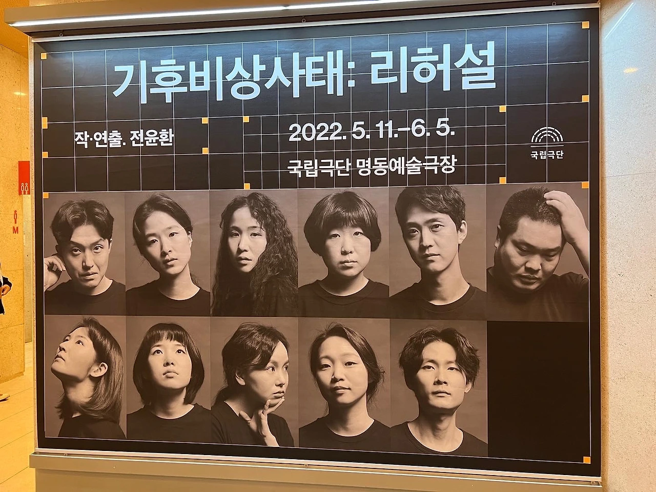 연극은 '더 빨리, 더 많이'를 외쳐며 달려오던 우리들의 모습을 들여다보고 반성하게 한다. 기후 위기가 멀리 있지 않다는 걸 느끼고 가슴이 답답해지기도 한다. 리뷰를 쓰려고 인스타그램을 살펴보다가 누군가 이 연극 프로그램 북에 '와닿지 않는 위기를 가깝게 느끼도록 만드는 게 예술가의 몫'이라 쓰여 있었다는 얘기를 읽었다. 그렇다면 서른여섯 살밖에 안 된 젊은 연출가이자 극작가인 전윤환의 의도는 꽤 성공했다고 생각한다. 그는 뛰어난 설정과 대사 창조로 '기후비상사태'의 심각성을 관객들에게 잘 전달하고 있으니까. 드라마 트루기로 참여한 조천호 기후과학자의 역할도 좋은 작품을 만드는 데 큰 역할을 했음은 물론이다. 아내는 자신이 작년에 쓴 돈 중 가장 잘한 게 10만 원 내고 국립극단 연회원이 된 거라며 웃었다. 옆에서 늘 아내 덕을 보는 나도 그 의견에 동의하는 뜻으로 과장되게 큰 웃음을 지었다. 5월 11일부터 6월 5일까지 명동예술극장에서 상연하다. 시간 내서 꼭 보시기 바란다(*마지막 사진은 김세환 배우가 코로나 19 이전에 극단 동료들과 찍은 사진이라는데 분위기가 너무 좋아서 그의 인스타그램에서 가져왔다).