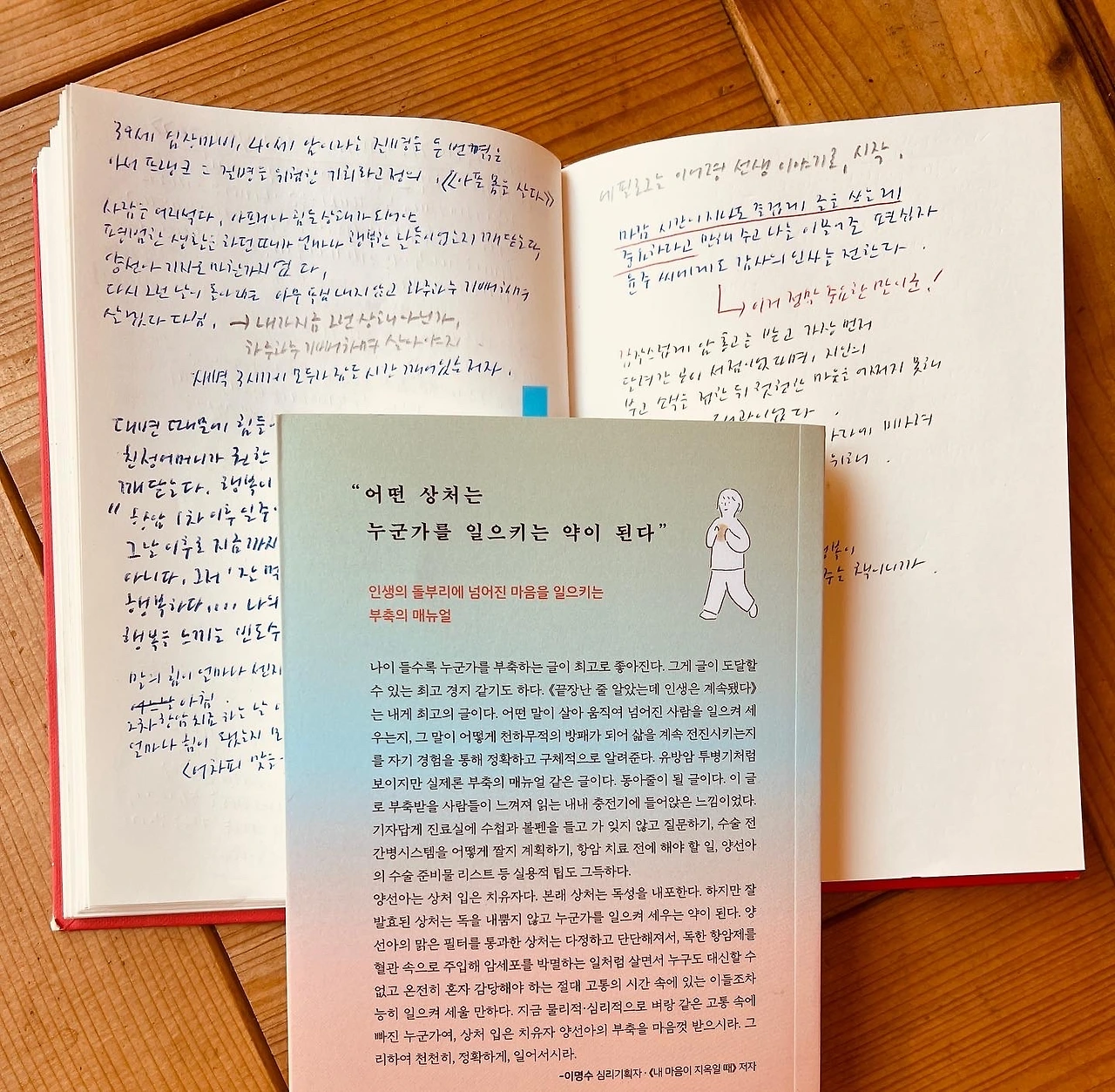 앞에서도 얘기했지만 암에 걸리자마자 책을 찾아 읽으며 암에 대해 공부하는 저자의 태도는 중요하다. 회피하지 않고 문제를 정면으로 바라보는 게 회복 의지를 키우는 첫 번째 일이기 때문이다. 책 중간에 정혜신 선생의 『당신이 옳다』 얘기가 나오는데 책 뒤엔 이명수 선생의 추천사가 나온다. 둘 다 내겐 스승 같은 분인데 한 책에 나오는 게 신기했다. 좋은 책이다. 암 얘기로 시작하지만 결국은 아프지 않은 상태의 내가 누리고 있는 평범한 일상의 행복이 얼마나 소중한지 깨닫게 해주는 책이니까. 아내가 얼른 읽고 동숭동 다연한의원에 가져다 드리자고 했다. 보다 많은 분들이 이 책을 읽었으면 하는 마음에서다. 저자의 다음 책이 기다려진다.